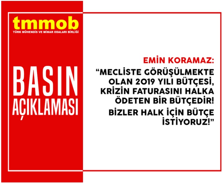 Cumhurbaşkanlığı tarafından hazırlanan ve TBMM`de görüşmeleri devam eden 2019 Yılı Merkezi Yönetim Bütçesi`ne ilişkin TMMOB Yönetim Kurulu Başkanı Emin Koramaz tarafından 17 Aralık 2018 tarihinde bir açıklama yapıldı.