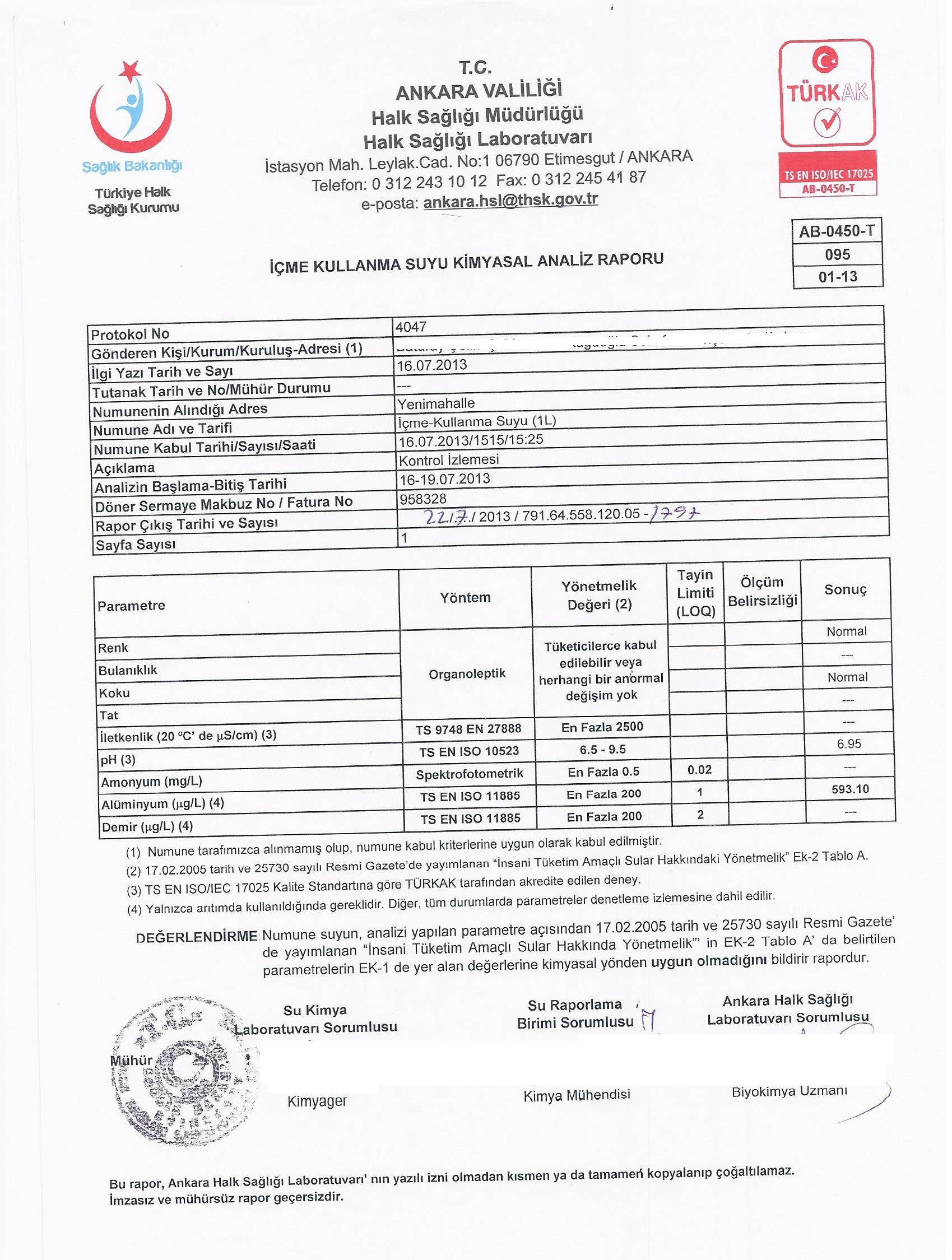 EKLER: 1) 22.07.2013 tarihli İçme Kullanma Suyu Kimyasal Analiz Raporları (4 sf)