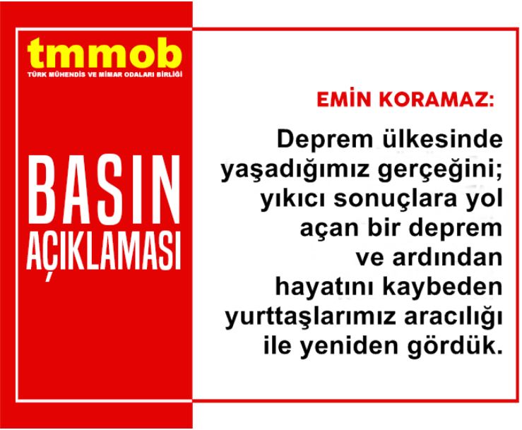 TMMOB Yönetim Kurulu Başkanı Emin KORAMAZ 30 Ekim 2020 tarihinde İzmir`de yaşanan deprem felaketi üzerine bir basın açıklaması yaptı.