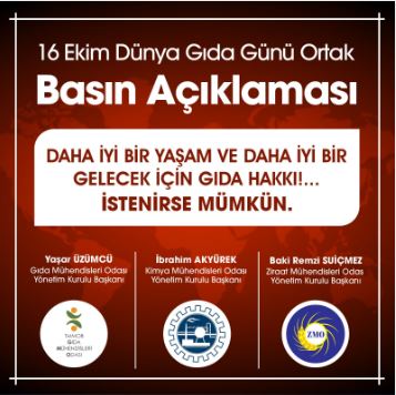 Bu yıl 70. Kuruluş yılını kutlayan Türk Mühendis ve Mimar Odaları Birliği, bilimin ve tekniğin gücünü halktan yana kullanmaya devam etme kararlılığındadır. Bizler, TMMOB`ye bağlı Gıda, Kimya ve Ziraat Mühendisleri Odaları aynı anlayışla; açlığın, yokluğun ve yoksulluğun son bulduğu, hakça ve adil paylaşımın olduğu bir ülke ve dünya özlemiyle bilimden, üretimden, insandan, emekten, doğadan, kamu yararı ve toplum çıkarından yana tutumumuz sürecektir.