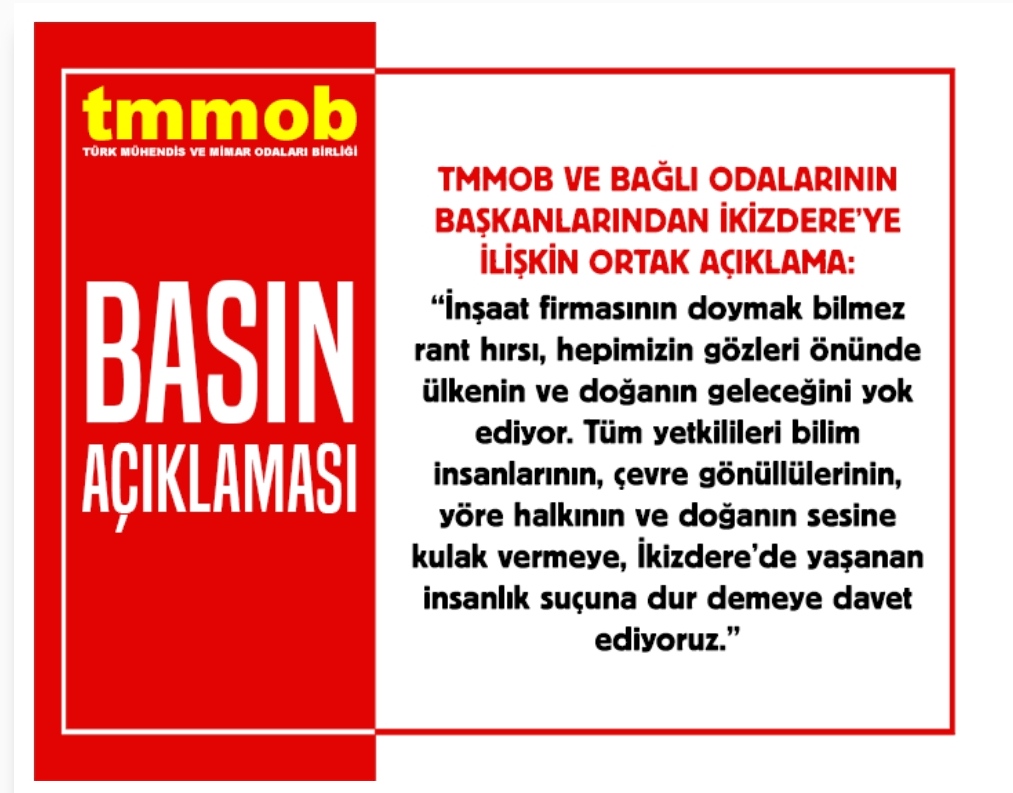 İkizdere`de daha şimdiden, taşocağı bölgesine yol açabilmek için binlerce ağaç yok edildi. İnşaat firmasının doymak bilmez rant hırsı, hepimizin gözleri önünde ülkenin ve doğanın geleceğini yok ediyor. Tüm yetkilileri bilim insanlarının, çevre gönüllülerinin, yöre halkının ve doğanın sesine kulak vermeye, bu insanlık suçuna dur demeye davet ediyoruz.