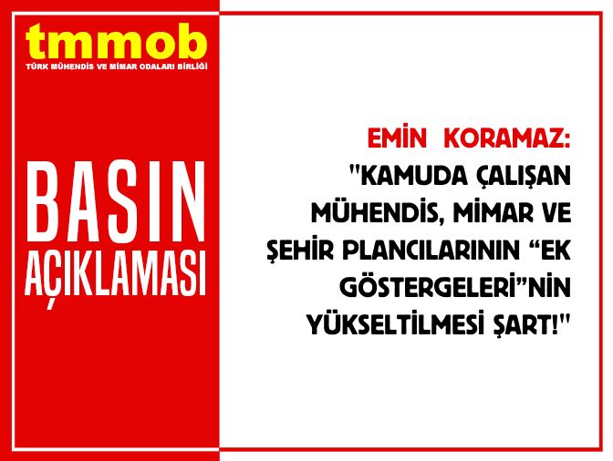 Kamu çalışanlarının ek göstergelerine ilişkin Çalışma ve Sosyal Güvenlik Bakanı başkanlığında düzenlenen Ek Gösterge Komisyonunun ilk toplantısı üzerine TMMOB Yönetim Kurulu Başkanı Emin Koramaz tarafından kamuda çalışan mühendis, mimar ve şehir plancılarının talepleri hakkında basın açıklaması yapıldı.