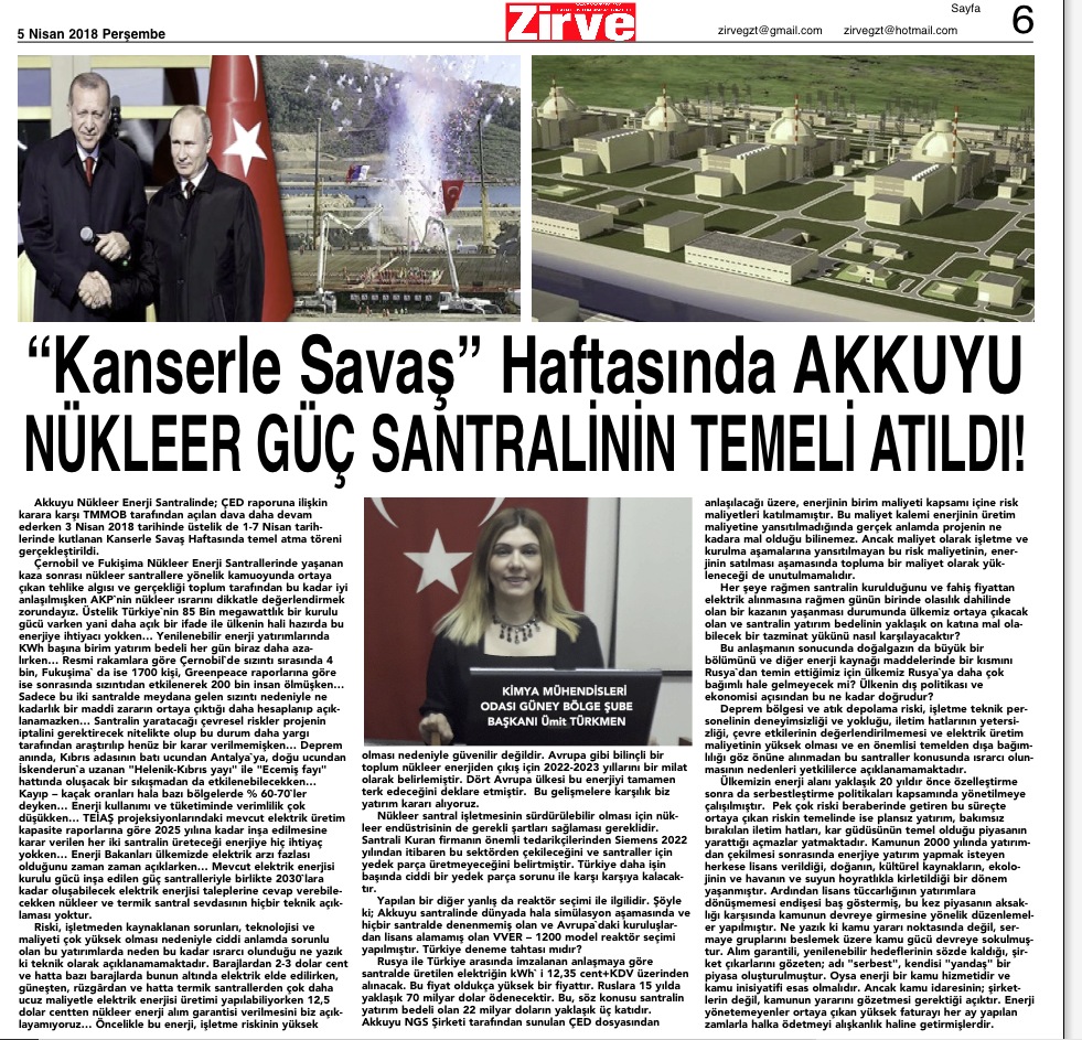 Akkuyu Nükleer Enerji Santralinde; ÇED raporuna ilişkin karara karşı TMMOB tarafından açılan dava daha devam ederken 3 Nisan 2018 tarihinde üstelik de 1-7 Nisan tarihlerinde kutlanan Kanserle Savaş Haftasında temel atma töreni gerçekleştirildi.