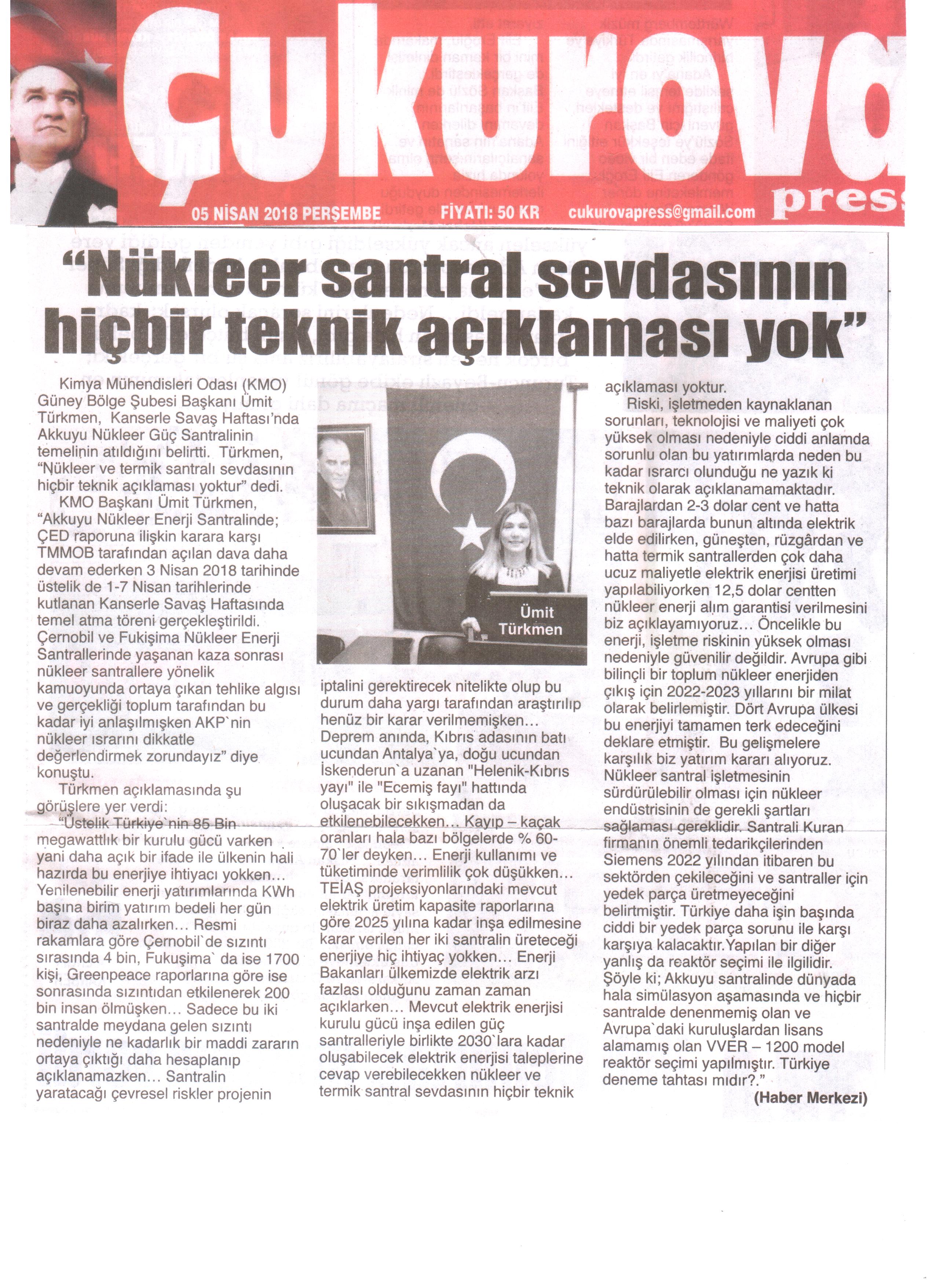 Çernobil ve Fukişima Nükleer Enerji Santrallerinde yaşanan kaza sonrası nükleer santrallere yönelik kamuoyunda ortaya çıkan tehlike algısı ve gerçekliği toplum tarafından bu kadar iyi anlaşılmışken AKP`nin nükleer ısrarını dikkatle değerlendirmek zorundayız. Üstelik Türkiye`nin 85 Bin megawattlık bir kurulu gücü varken yani daha açık bir ifade ile ülkenin hali hazırda bu enerjiye ihtiyacı yokken… Yenilenebilir enerji yatırımlarında KWh başına birim yatırım bedeli her gün biraz daha azalırken… Resmi rakamlara göre Çernobil`de sızıntı sırasında 4 bin, Fukuşima` da ise 1700 kişi, Greenpeace raporlarına göre ise sonrasında sızıntıdan etkilenerek 200 bin insan ölmüşken… Sadece bu iki santralde meydana gelen sızıntı nedeniyle ne kadarlık bir maddi zararın ortaya çıktığı daha hesaplanıp açıklanamazken… Santralin yaratacağı çevresel riskler projenin iptalini gerektirecek nitelikte olup bu durum daha yargı tarafından araştırılıp henüz bir karar verilmemişken… Deprem anında, Kıbrıs adasının batı ucundan Antalya`ya, doğu ucundan İskenderun`a uzanan "Helenik-Kıbrıs yayı" ile "Ecemiş fayı" hattında oluşacak bir sıkışmadan da etkilenebilecekken… Kayıp – kaçak oranları hala bazı bölgelerde % 60-70`ler deyken… Enerji kullanımı ve tüketiminde verimlilik çok düşükken… TEİAŞ projeksiyonlarındaki mevcut elektrik üretim kapasite raporlarına göre 2025 yılına kadar inşa edilmesine karar verilen her iki santralin üreteceği enerjiye hiç ihtiyaç yokken… Enerji Bakanları ülkemizde elektrik arzı fazlası olduğunu zaman zaman açıklarken… Mevcut elektrik enerjisi kurulu gücü inşa edilen güç santralleriyle birlikte 2030`lara kadar oluşabilecek elektrik enerjisi taleplerine cevap verebilecekken nükleer ve termik santral sevdasının hiçbir teknik açıklaması yoktur.