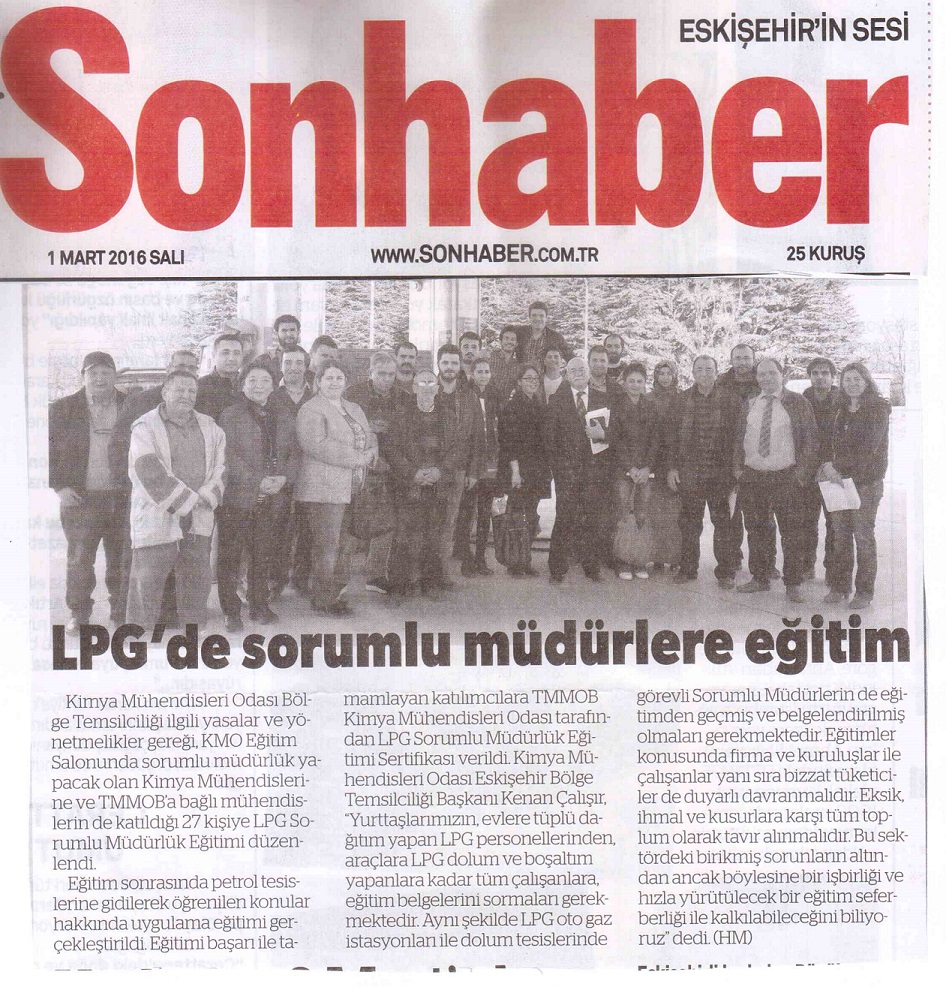 26-27-28 ŞUBAT 2016 tarihinde Bölge Temsilciliğimiz Ali Atabey Eğitim Salonunda düzenlenen LPG OTOGAZ İSTASYONU SORUMLU MÜDÜR EĞİTİMİ Kimya Mühendisleri ve TMMOBne bağlı Mühendislerin katılımıyla başarıyla tamamlanmıştır. Eğitimimiz Eskişehir yerel basınında yer aldı.