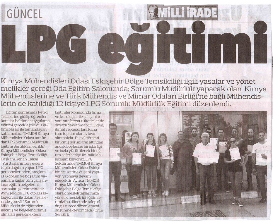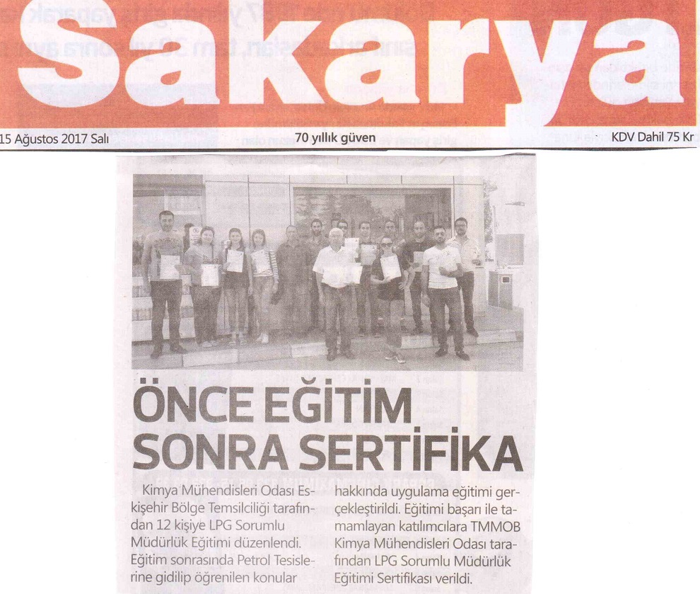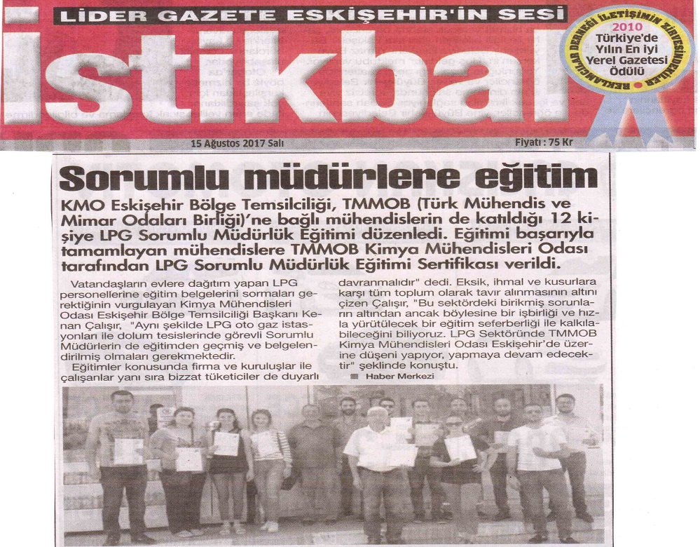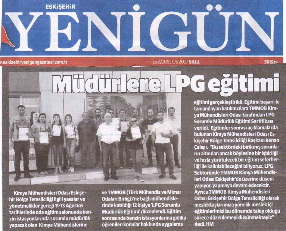 11-12-13 AĞUSTOS 2017 tarihinde Bölge Temsilciliğimiz Ali Atabey Eğitim Salonunda düzenlenen LPG OTOGAZ İSTASYONU SORUMLU MÜDÜR EĞİTİMİ Kimya Mühendisleri ve TMMOBne bağlı Mühendislerin katılımıyla başarıyla tamamlanmıştır. Eğitimimiz Eskişehir yerel basınında yer aldı.