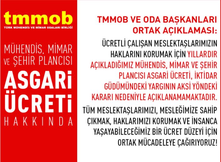 Bu hususta bugüne değin lehimize sonuçlanmış birçok yargı kararı bulunmasına karşın ne yazık ki, yakın zamanda görüşülen bir davada, "Birliğimizin Mühendis, Mimar ve Şehir Plancıları için asgari ücret belirleyemeyeceği" yönünde karar verilmiştir. Hukuk devleti ilkesi ve idari yargı kararlarının uygulanması zorunluluğu gereği bu karar nedeniyle, yeni bir hukuki durum ortaya çıkana kadar, Birliğimizce Mühendis, Mimar ve Şehir Plancısı Asgari Ücreti açıklanamayacaktır. Söz konusu karara ve Birliğimizin Anayasa`dan gelen yetki ve görevlerinin engellenmesine yönelik tüm girişimlere karşı hukuki mücadelemiz devam edecektir.