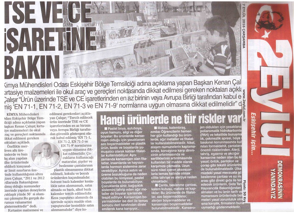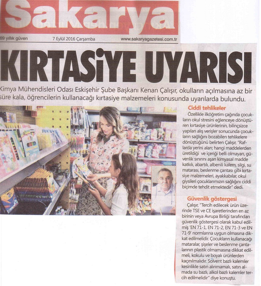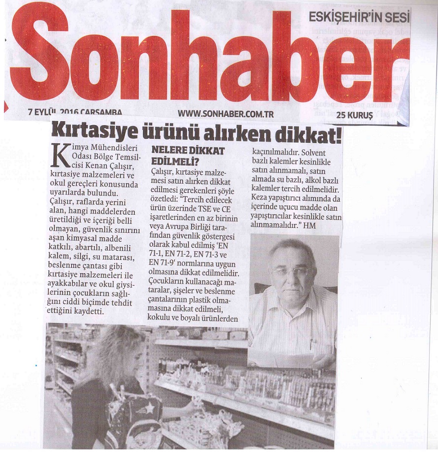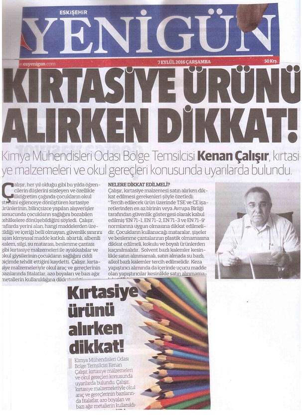 Yeni eğitim öğretim döneminin başlamasıyla "Çocukların kullanacağı kırtasiye malzemelerindeki kimyasal risklerin kontrol altında tutulması gerekliliğini kamuoyuna duyurulması" amacıyla Kimya Mühendisleri Odası Eskişehir Bölge Temsilciliğimizin yaptığı basın açıklaması Eskişehirin yerel gazetelerinde yerini aldı.