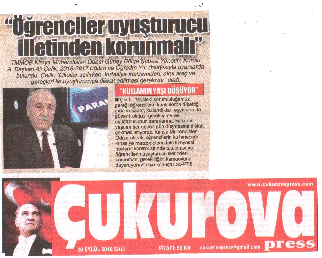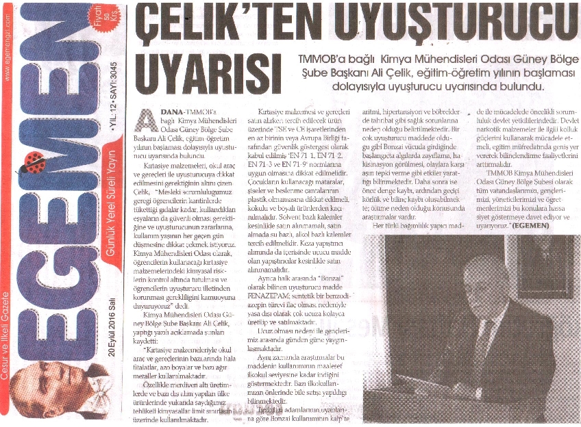 TMMOB KİMYA MÜHENDİSLERİ ODASI GÜNEY BÖLGE ŞUBESİ UYARIYOR! OKULLAR AÇILIRKEN; KIRTASİYE MALZEMELERİ, OKUL ARAÇ VE GEREÇLERİ İLE UYUŞTURUCUYA DİKKAT!-19.09.2016