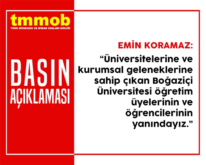 Geçmiş yıllarda AKP İl Yöneticisi ve milletvekili aday adayı olan Melih Bulu`nun, hiçbir kurumsal bağının bulunmadığı Boğaziçi Üniversitesi`ne rektör olarak atanması üzerine TMMOB Yönetim Kurulu Başkanı Emin Koramaz tarafından 5 Ocak 2021 tarihinde basın açıklaması yapıldı.