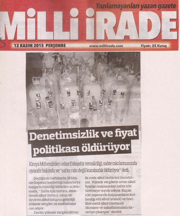Geçtiğimiz haftalarda 28 kişinin hayatını kaybettiği haberlerini kaygıyla izliyoruz. Sahte içki üretimi, denetimsiz alkol üretimi, satışı ve devletin alkol satışına getirdiği yüksek vergiler ve kısıtlamalar can alıyor. Buna dikkat çekmek amacıyla Bölge Temsilciliğimizin yaptığı basın açıklaması; Eskişehir Yerel gazetelerinde yayınlandı