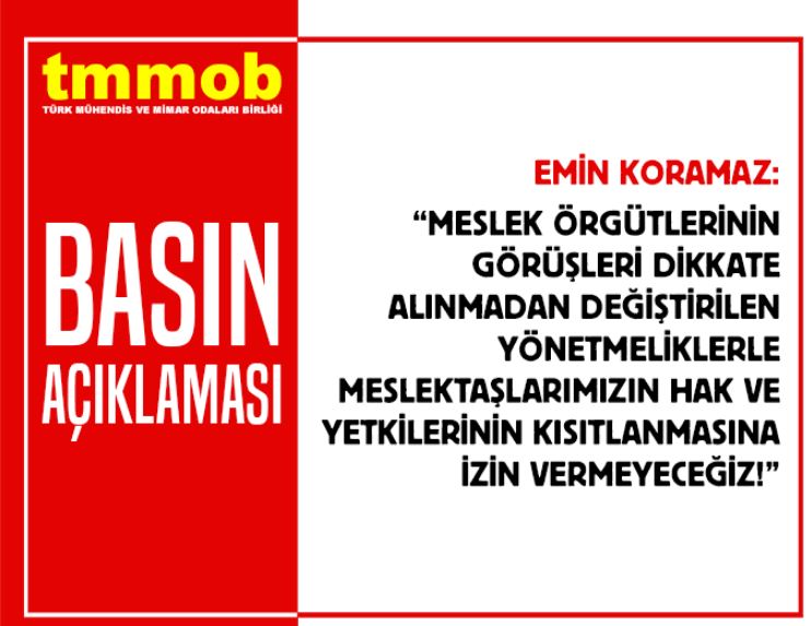 Yürürlüğe giren "Yapı Malzemeleri ve Zemin Laboratuvarları Yönetmeliği" ve değiştirilen `Yapı Denetim Uygulama Yönetmeliği` ile meslektaşlarımızı ve meslek örgütlerimizi yapı denetim süreçlerinden dışlanmak istenmesine karşı TMMOB Yönetim Kurulu Başkanı Emin Koramaz tarafından 18 Aralık 2020 tarihinde basın açıklaması yapıldı.