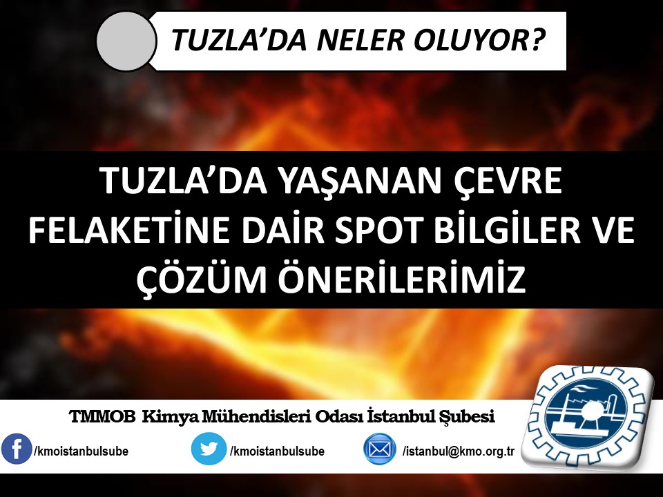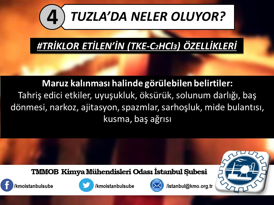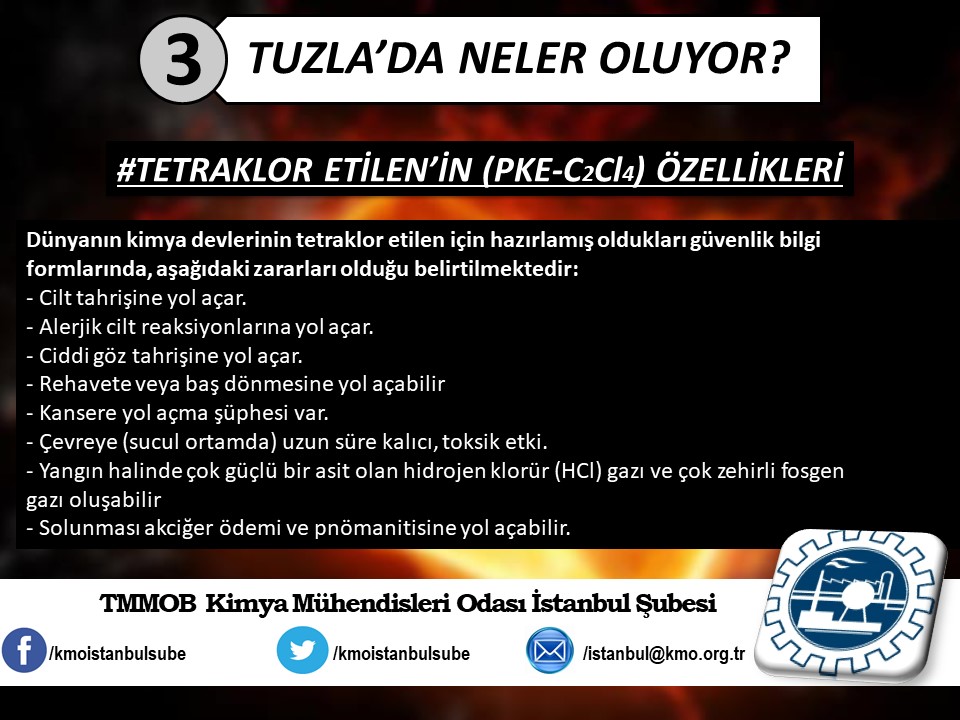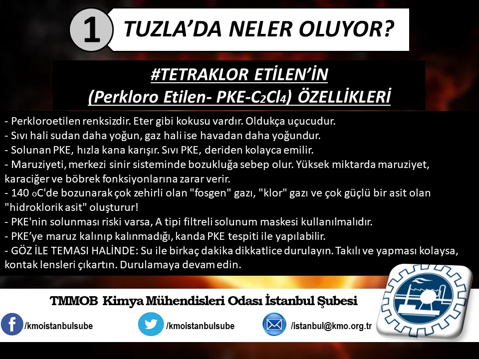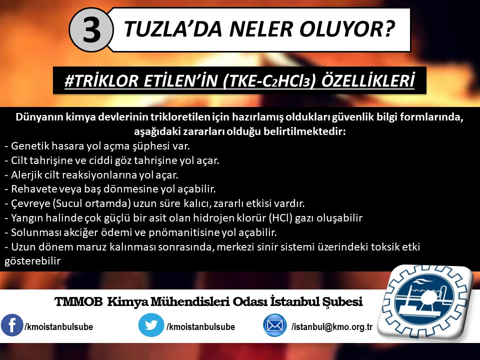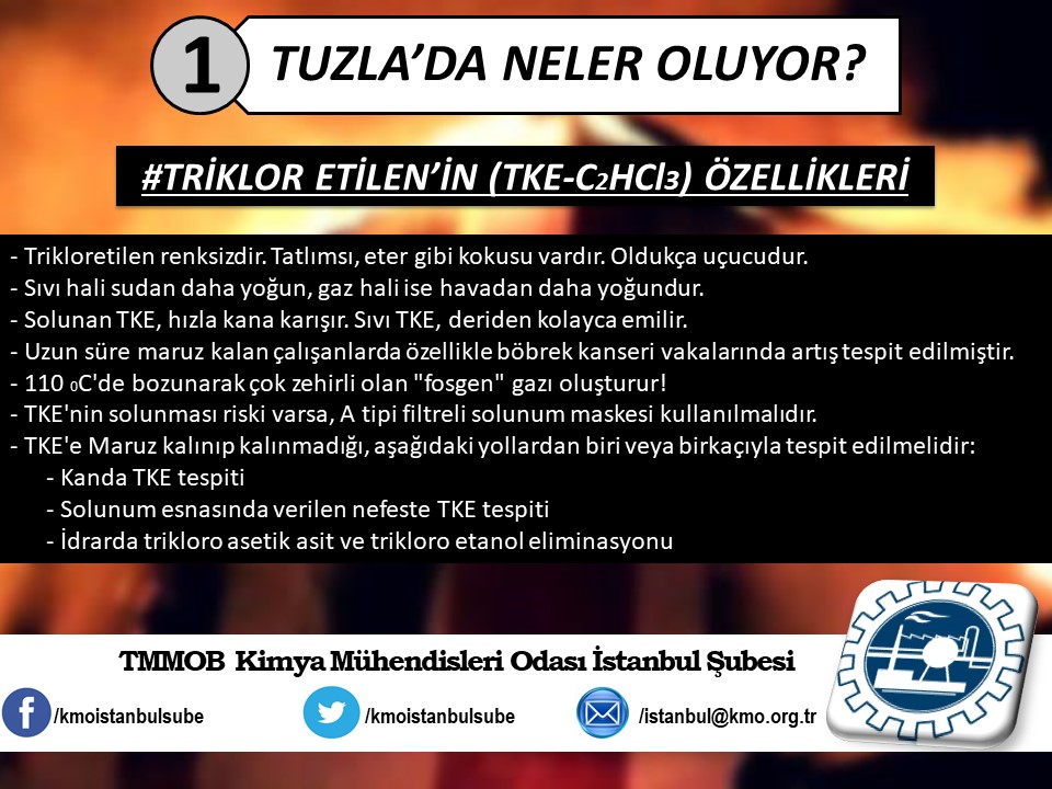 Tuzla`da yaşanan kimyasal felaketin ardından, ertesi gün Şubemiz tarafından basın açıklaması yapılmıştı (http://www.kmo.org.tr/genel/bizden_detay.php?kod=3741). Basın açıklamamız yetkili kurum ve kişilerin, henüz kimyasal maddelerin analizini yapmadan "zararsız" şeklinde açıklama yaparak kamuoyunu yanıltmalarına da yönelik bir eleştiri idi. Öğle saatlerinde İSKİ tarafından yapılan açıklamada, kimyasal analizin yapıldığını ve Tuzla`da insanları hastanelik eden kimyasal sızıntının, ismi açıklanmayan bir firmanın kanalizasyon boşalttığı "Triklor Etilen" ve "Tetrachior Cezhene" olduğunu belirtmişti. Ancak "Tetrachior Cezhene" olarak açıklanan kimyasal maddenin kimya literatüründe bir karşılığının bulunmadığını açıklamamızın üzerine yeni bir açıklama yaparak, analiz sonucunu "Triklor Etilen" ve "Tetraklor Etilen" olarak değiştirdiler. TMMOB Kimya Mühendisleri Odası İstanbul Şubesi olarak, ismi bildirilen bu iki kimyasal maddeye yönelik, kısaltılmış özet bilgi halinde spot bilgileri paylaştık. Ayrıca Tuzla`da gerçekleştiği gibi daha önce de çok kez yaşanan kimyasallar kaynaklı kazalarda, bilimin, aklın ışığında mesleki sorumluluğumuz gereği ve halkımızın sağlığı için sunduğumuz önerilerimizi de spot bilgiler halinde paylaştık.