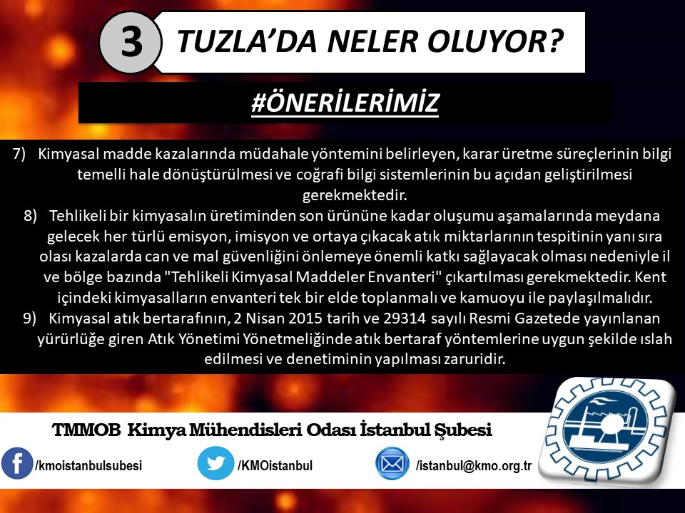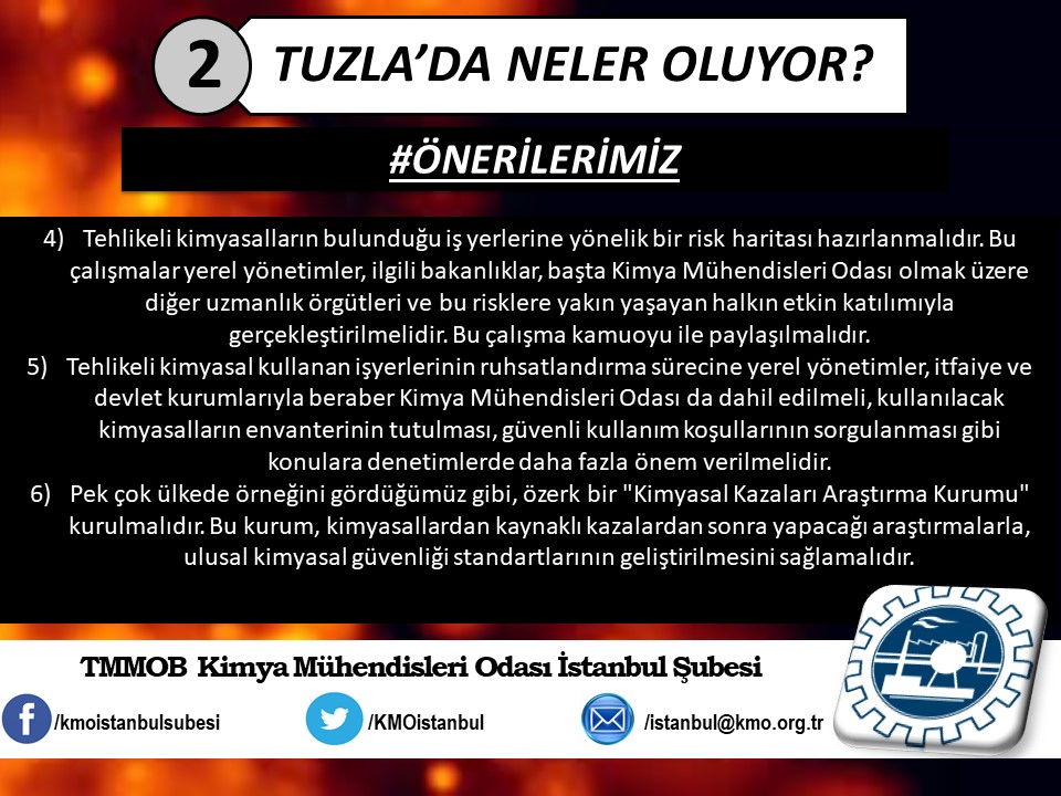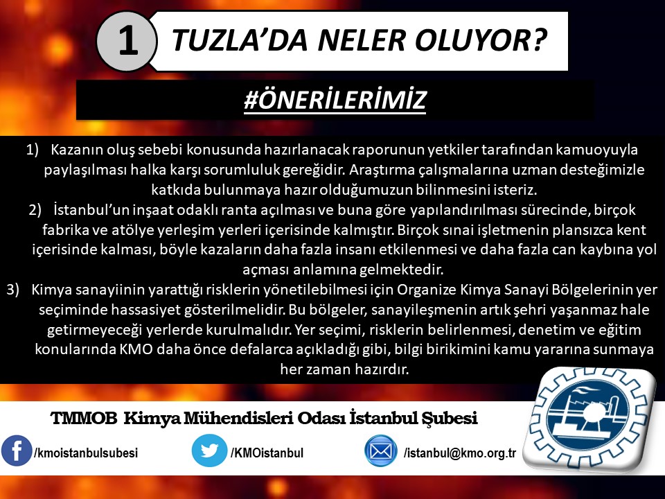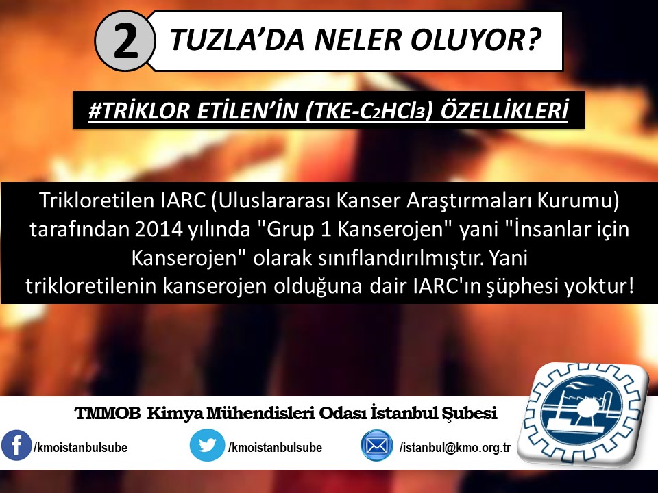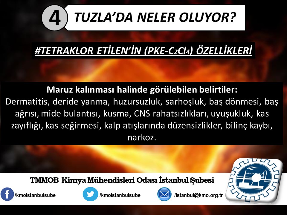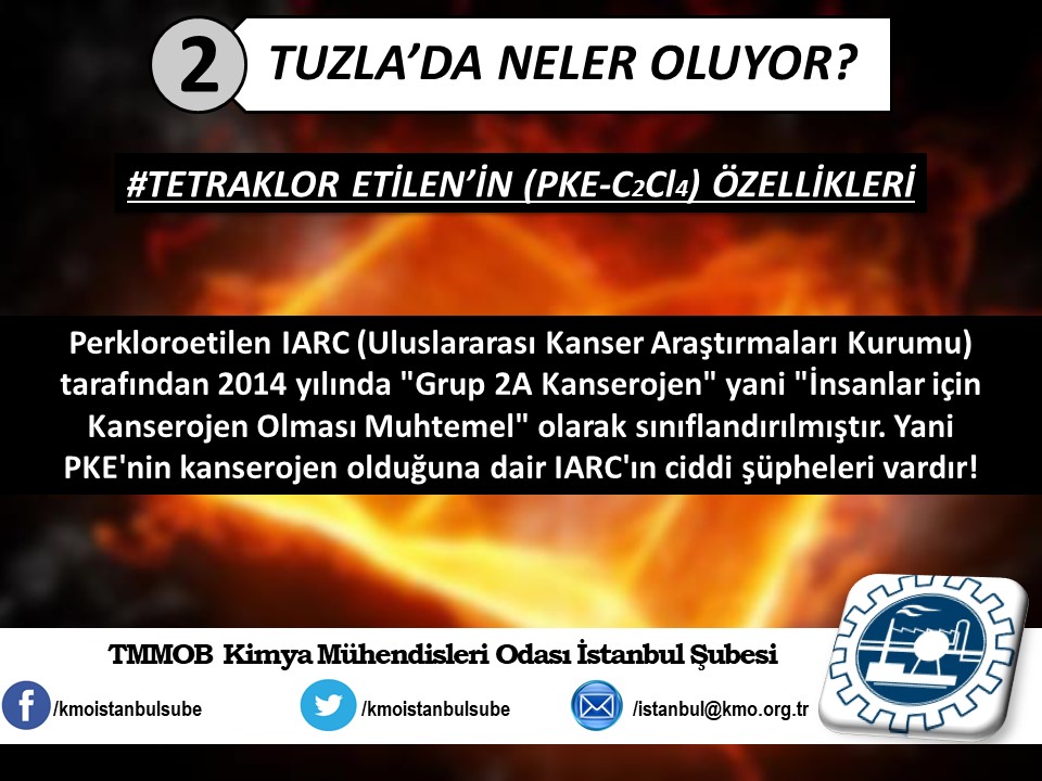 Tuzla`da yaşanan kimyasal felaketin ardından, ertesi gün Şubemiz tarafından basın açıklaması yapılmıştı (http://www.kmo.org.tr/genel/bizden_detay.php?kod=3741). Basın açıklamamız yetkili kurum ve kişilerin, henüz kimyasal maddelerin analizini yapmadan "zararsız" şeklinde açıklama yaparak kamuoyunu yanıltmalarına da yönelik bir eleştiri idi. Öğle saatlerinde İSKİ tarafından yapılan açıklamada, kimyasal analizin yapıldığını ve Tuzla`da insanları hastanelik eden kimyasal sızıntının, ismi açıklanmayan bir firmanın kanalizasyon boşalttığı "Triklor Etilen" ve "Tetrachior Cezhene" olduğunu belirtmişti. Ancak "Tetrachior Cezhene" olarak açıklanan kimyasal maddenin kimya literatüründe bir karşılığının bulunmadığını açıklamamızın üzerine yeni bir açıklama yaparak, analiz sonucunu "Triklor Etilen" ve "Tetraklor Etilen" olarak değiştirdiler. TMMOB Kimya Mühendisleri Odası İstanbul Şubesi olarak, ismi bildirilen bu iki kimyasal maddeye yönelik, kısaltılmış özet bilgi halinde spot bilgileri paylaştık. Ayrıca Tuzla`da gerçekleştiği gibi daha önce de çok kez yaşanan kimyasallar kaynaklı kazalarda, bilimin, aklın ışığında mesleki sorumluluğumuz gereği ve halkımızın sağlığı için sunduğumuz önerilerimizi de spot bilgiler halinde paylaştık.