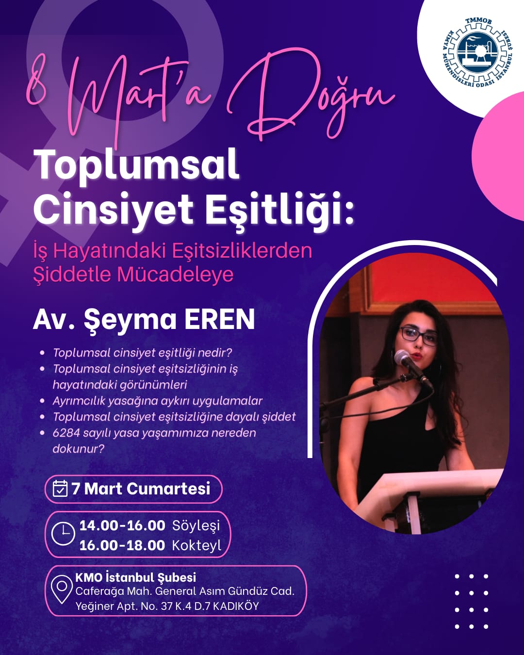 8 Mart kapsamında düzenleyeceğimiz bu buluşmamızda; eşitlik, iş hayatındaki eşitsizlikler, ayrımcılıkla mücadele, toplumsal cinsiyete dayalı şiddet ve 6284 sayılı yasanın kadınların yaşamına etkileri üzerine birlikte düşünecek ve konuşacağız.