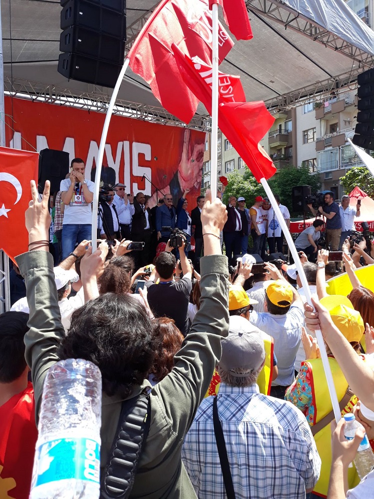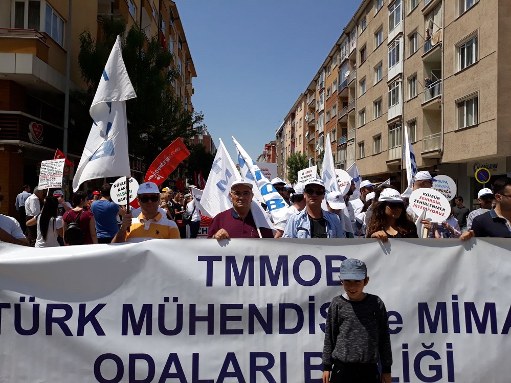 Aytaç Caddesi başında bir araya gelen sendikalar, meslek odaları, siyasi partiler, demokratik kitle örgütleri buradan sloganlar eşliğinde yürüyüşe geçti. Davul zurna eşliğinde işçiler, emekçiler hem yürüdüler hem oynadılar hem de sloganlar attılar.
