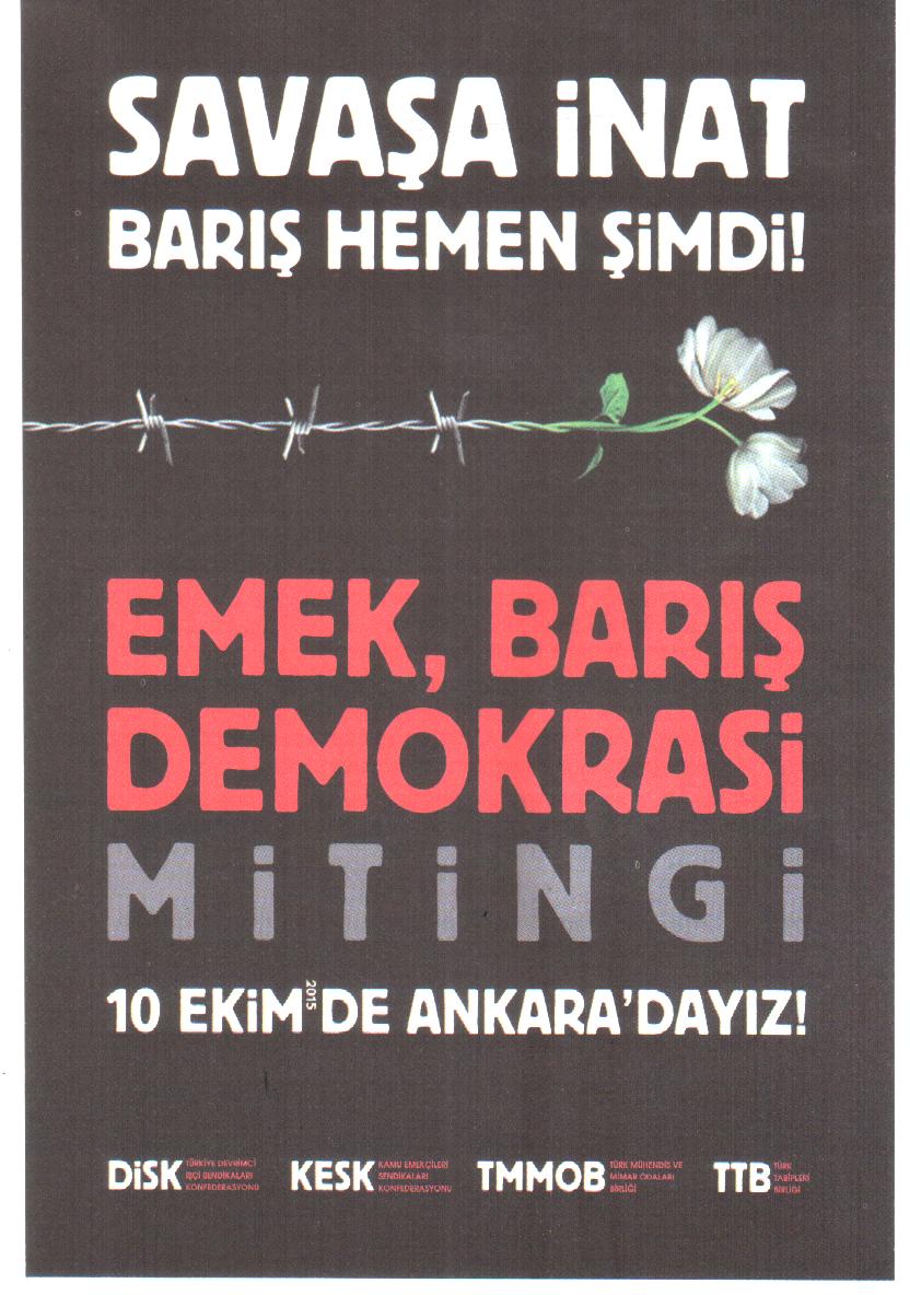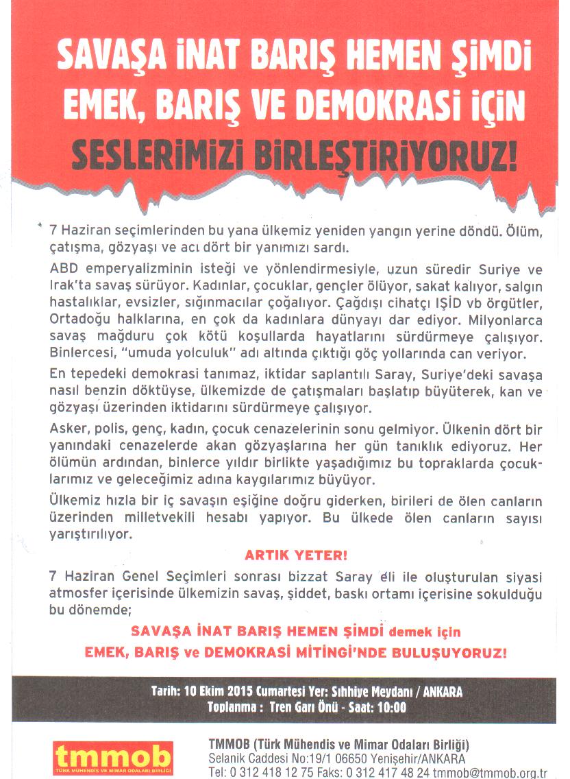 TMMOB-DİSK-KESK-TTB tarafından 10 Ekim 2015`de Ankara da düzenlenecek olan EMEK,BARIŞ,DEMOKRASİ MİTİNGİ için Her il den İl Koordinasyon Kurulları organizasyonunda 9 Ekim 2015 Cuma günü otobüslerimiz Ankara`ya hareket edecektir. Sorunsuz bir organizasyon sağlanabilmesi için katılımcı sayısının bilinmesi gerekmektedir. Bu nedenden dolayı, mitinge katılacak olan üyelerimizin isimlerini Adana da şubemize, diğer illerde ise İl Temsilcilerimize bildirmeleri gerekmektedir.