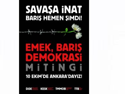 Sözümüzü hep birlikte söylemek ve mücadelemizi büyütmek için DİSK, KESK, TMMOB, TTB olarak 10 Ekim`de Ankara`da "Emek Barış Demokrasi" mitingi yapma kararı aldık. Mitinge katılım için çağrımız bu ülkede insandan, emekten, haktan, hukuktan, adaletten, kardeşlikten, barıştan yana olan örgütlü örgütsüz herkesedir.
