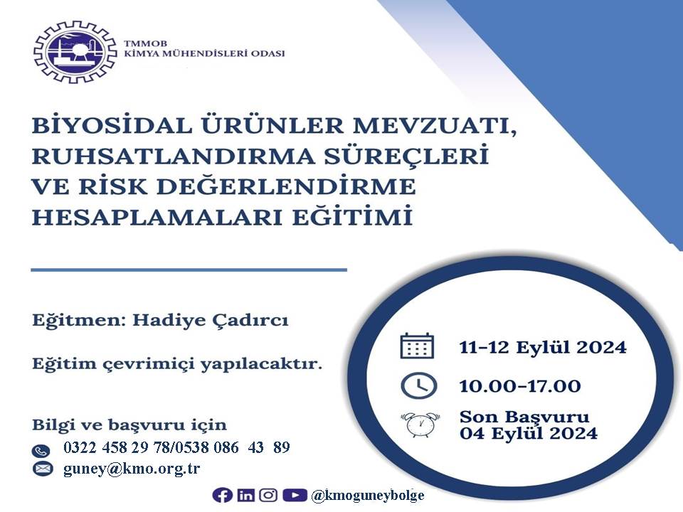 TMMOB Kimya Mühendisleri Odası tarafından 11-12 Eylül 2024 tarihlerinde 10.00-17.00 saatleri arasında "Biyosidal Ürünler Mevzuatı, Ruhsatlandırma Süreçleri ve Risk Değerlendirme Hesaplamaları Eğitimi" zoom programı üzerinden online olarak düzenlenecektir. Eğitim ile ilgili detaylı bilgi aşağıda yer almakta olup eğitime katılmak isteyenlerin, ekte gönderilen başvuru formunu doldurup istenen belgeler ile birlikte 4 Eylül 2024 tarihine kadar guney@kmo.org.tr adresine göndermelerini rica ederiz.