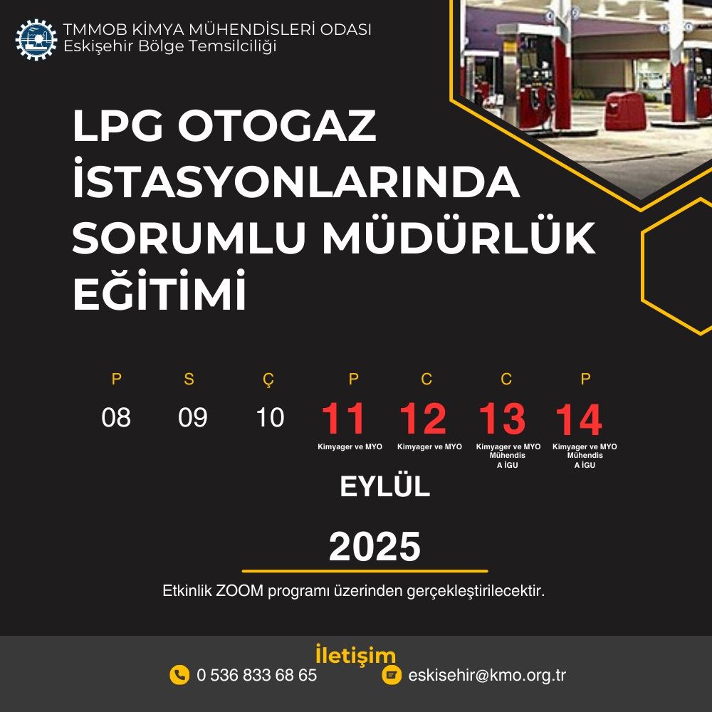 TMMOB Kimya Mühendisleri Odası Eskişehir Bölge Temsilciliği 11-14 Eylül 2025 OTOGAZ İSTASYONLARINDA SORUMLU MÜDÜRLÜK EĞİTİMİ* (UZAKTAN EĞİTİM)