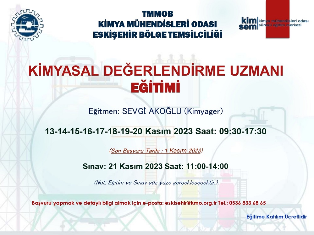 TMMOB Kimya Mühendisleri Odası Eskişehir Bölge Temsilciliği tarafından, T.C. Çevre, Şehircilik ve İklim Değişikliği Bakanlığı tarafından 23 Haziran 2017 tarih ve 30105 (Mükerrer) sayılı Resmi Gazete` de yayımlanmış olan "Kimyasalların Kaydı, Değerlendirilmesi, İzni ve Kısıtlanması (KKDİK) Hakkında Yönetmeliği" kapsamında 13-14-15-16-17-18-19-20 Kasım 2023 tarihlerinde KİMYASAL DEĞERLENDİRME UZMANI (KDU) EĞİTİMİ programlanmıştır.