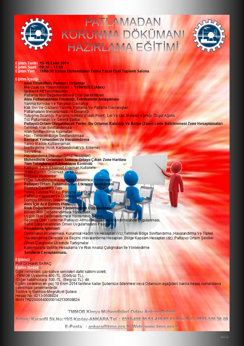 Patlayıcı ortam risklerinin tespit edilmesi, oluşabilecek patlamaların önlenmesi ve bunlardan korunmayı sağlamak amacıyla alınacak önlemler hakkında Şubemiz tarafından 15-16 Ekim 2014 tarihlerinde eğitim düzenlenecektir.Eğitim Tarihi :15-16 Ekim 2014