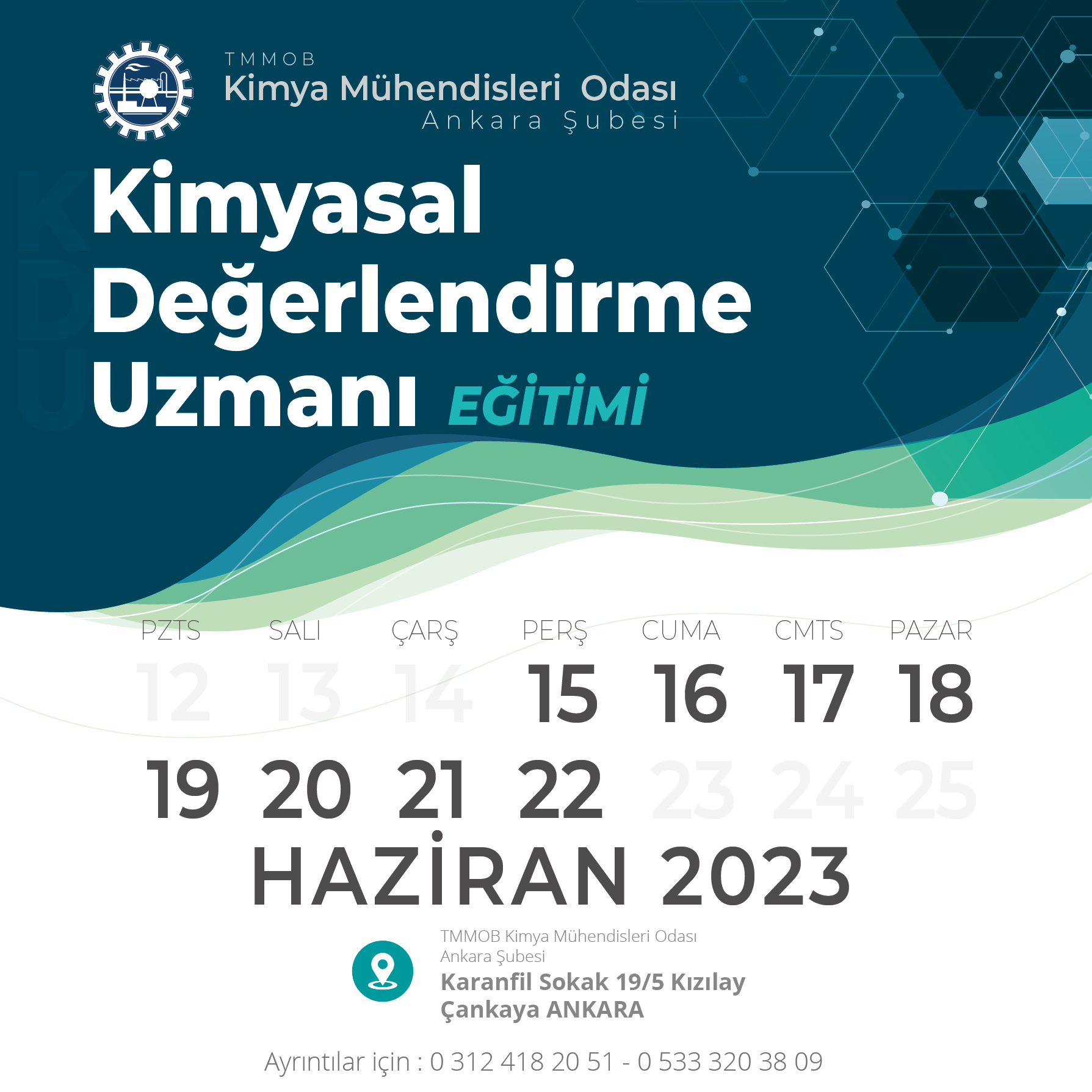TMMOB Kimya Mühendisleri Odası Ankara Şubesi tarafından, T.C. Çevre ve Şehircilik Bakanlığı tarafından 23 Haziran 2017 tarih ve 30105 (Mükerrer) sayılı Resmi Gazete` de yayımlanmış olan "Kimyasalların Kaydı, Değerlendirilmesi, İzni ve Kısıtlanması (KKDİK) Hakkında Yönetmeliği" kapsamında 15-16-17-18-19-20-21-22 Haziran 2023 tarihlerinde KİMYASAL DEĞERLENDİRME UZMANI (KDU) EĞİTİMİ programlanmıştır.