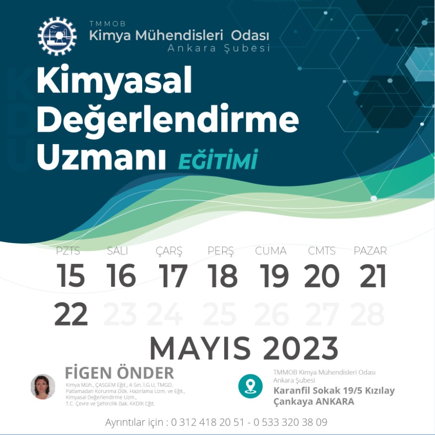 TMMOB Kimya Mühendisleri Odası Ankara Şubesi tarafından, T.C. Çevre ve Şehircilik Bakanlığı tarafından 23 Haziran 2017 tarih ve 30105 (Mükerrer) sayılı Resmi Gazete` de yayımlanmış olan "Kimyasalların Kaydı, Değerlendirilmesi, İzni ve Kısıtlanması (KKDİK) Hakkında Yönetmeliği" kapsamında 15-16-17-18-19-20-21-22 Mayıs 2023 tarihlerinde KİMYASAL DEĞERLENDİRME UZMANI (KDU) EĞİTİMİ programlanmıştır.