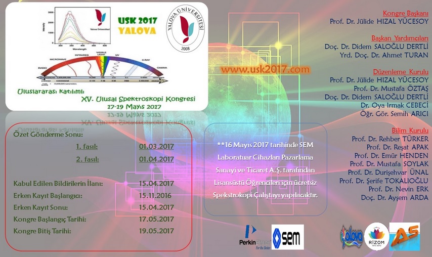 15. Ulusal Spektroskopi Kongresi Yalova Üniversitesi Kimya ve Süreç Mühendisliği Bölümü tarafından 17-19 Mayıs 2017 tarihleri arasında gerçekleştirilecektir.
