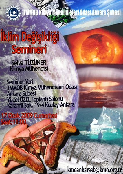 Şubemiz tarafından Sayın Selva TÜZÜNERin sunumuyla 17 Ocak 2009 Cumartesi günü saat 11:00de İklim Değişikliği Semineri düzenlenecektir. Tüm üye ve öğrenci üyelerimiz davetlidir. Ayrıntılı bilgi için yandaki resme tıklayınız.