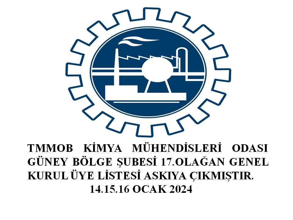 Şubemiz 17. Olağan Genel Kurulu ve seçimleri 20-21 Ocak 2024 tarihlerinde çoğunluklu, çoğunluk sağlanamadığı takdirde 27-28 Ocak 2024 tarihlerinde çoğunluksuz olarak aşağıda belirtilen gündem ve adreste I. günü genel kurul saat 11.00 - 14.00 arası, II. günü seçimler ise saat 9.00 - 17.00 arasında yapılacaktır. Seçime; Adana, Mersin, Hatay, Osmaniye, Kahramanmaraş, Gaziantep ve Kilis illerindeki Şubemize kayıtlı Kimya Mühendisleri katılacaktır.