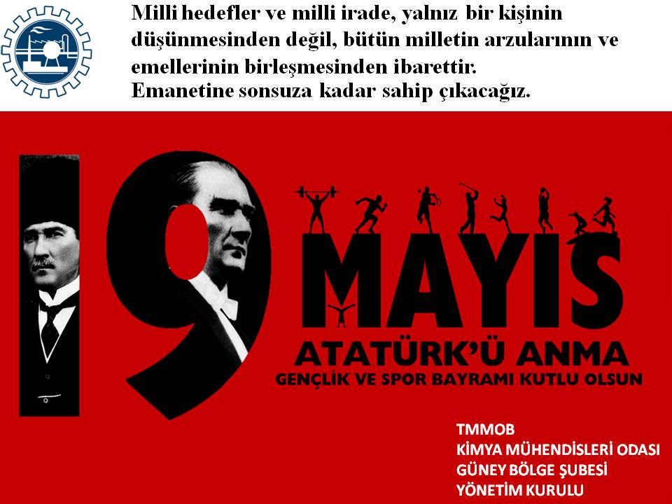 Milli hedefler ve milli irade, yalnız bir kişinin düşünmesinden değil, bütün milletin arzularının ve emellerinin birleşmesinden ibarettir. Emanetine sonsuza kadar sahip çıkacağız. 19 Mayıs Atatürkü Anma Gençlik ve Spor Bayramımız Kutlu Olsun. KMO Güney Bölge Şb. Yön. Kur. A. Başkan Çiğdem EROĞLU