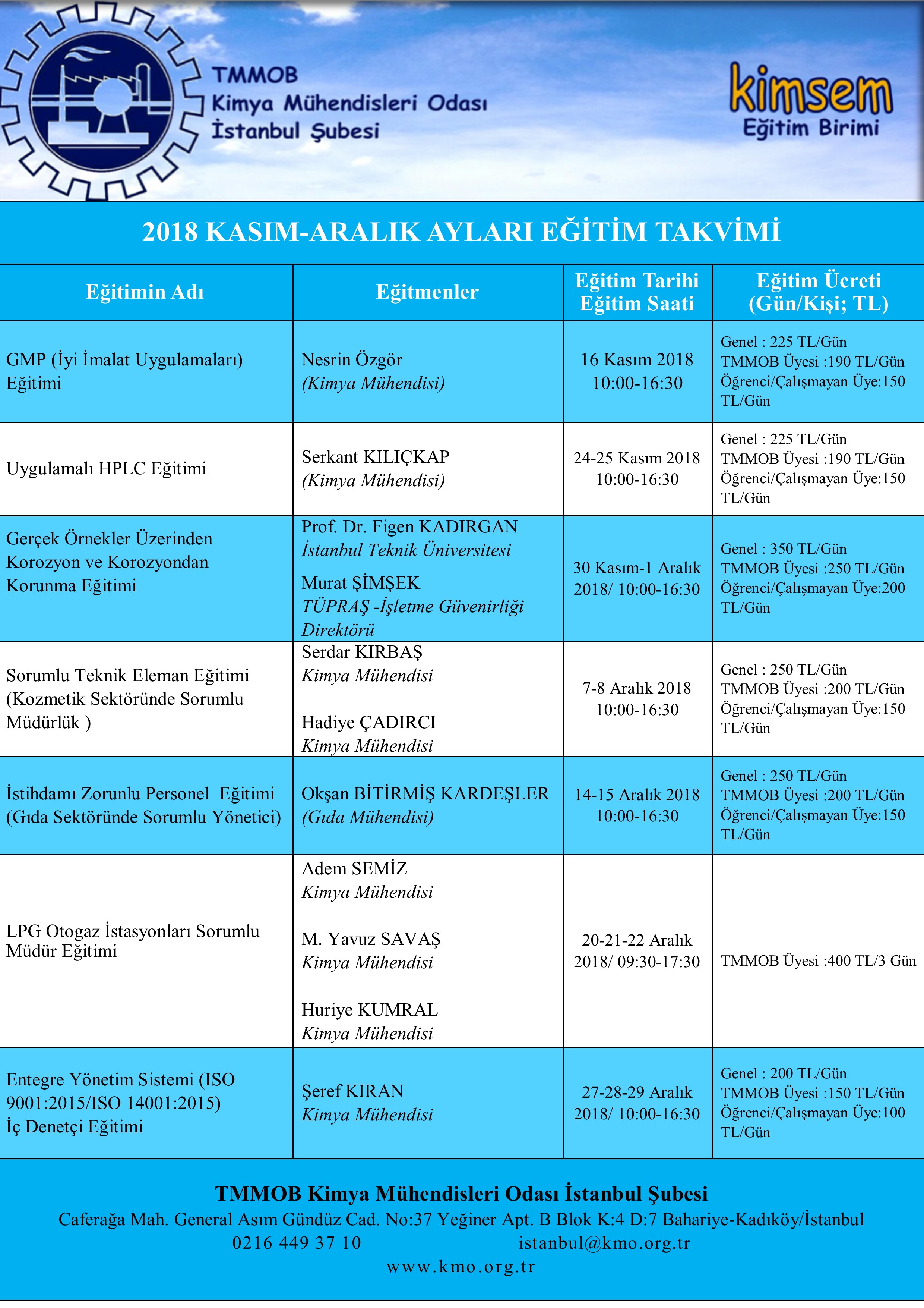 | GMP (İyi İmalat Uygulamaları) | Nesrin Özgör | 16 Kasım 2018 | Genel: 225 TL/Gün |