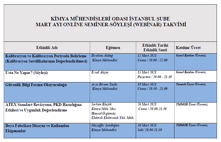 | Güvenlik Bilgi Formu Okuyuculuğu | Arzu Birsen Yayla | 19 Mart 2021 | Tmmob Üyesi /Ücretsiz |