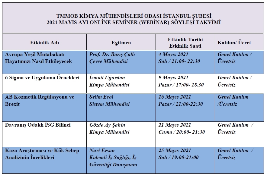 2021 Mayıs ayı ücretsiz online seminer (webinar) takvimi aşağıda yer almakta olup bu online etkinliklere katılmak isteyen meslektaşlarımız aşağıda bulunan başvuru formu linkine tıklayarak, açılan online formu doldurup katılım taleplerini Şubemize iletebilirler.
