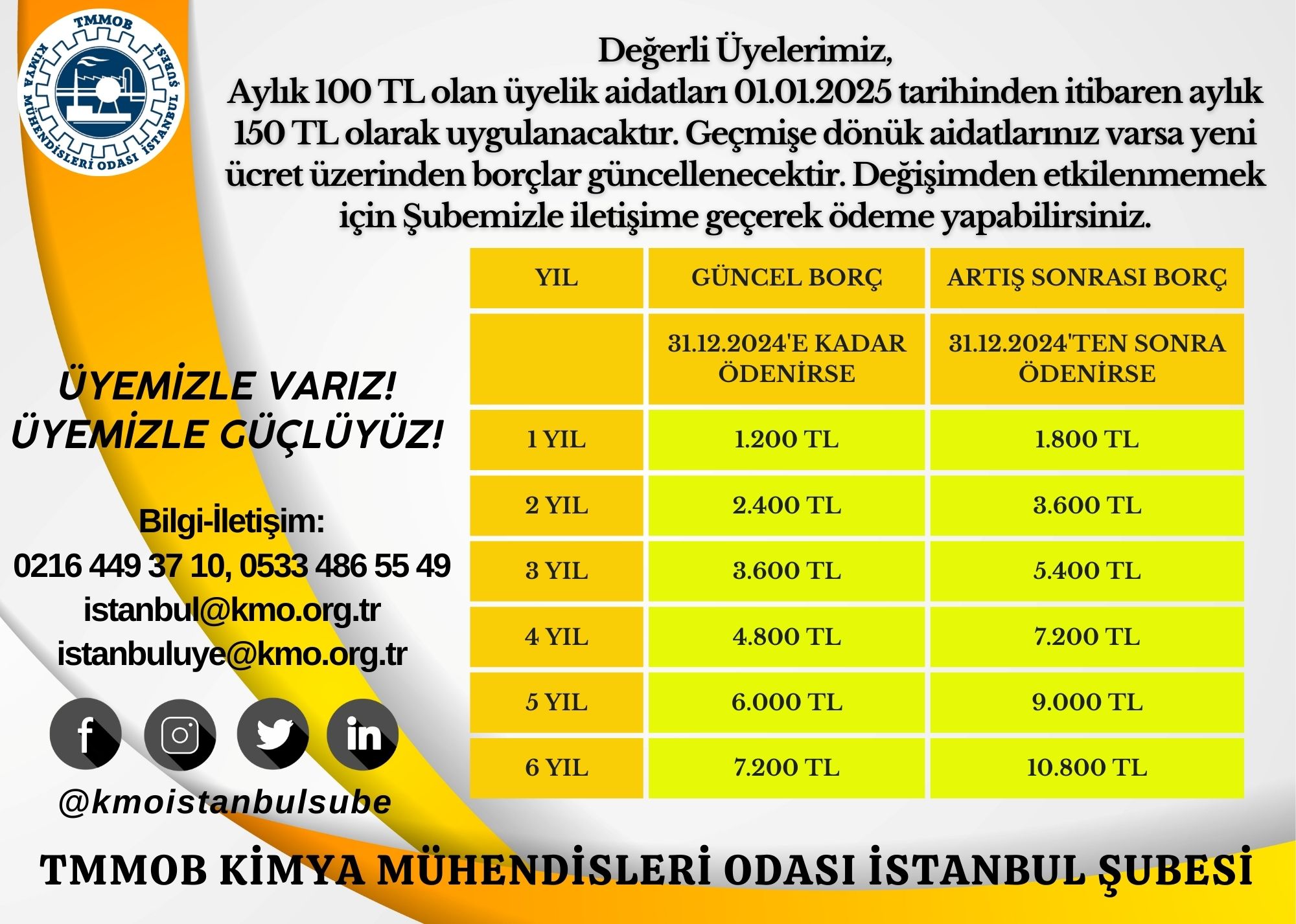 Oda Genel Kurul kararıyla üyelik aidat miktarı 1 Ocak 2025 tarihinden itibaren 150 TL/ay olarak uygulanacaktır. 2025 yılındaki aidat miktarı artışından etkilenmemek için üyelerimiz, birikmiş aidat borçlarını 31.12.2024 tarihine kadar şu an için geçerli olan 100 TL/ay üzerinden ödeyebilirler. Mevzuat gereği 2025 yılına kalan aidat borçları aylık 150 TL üzerinden güncellenecektir.