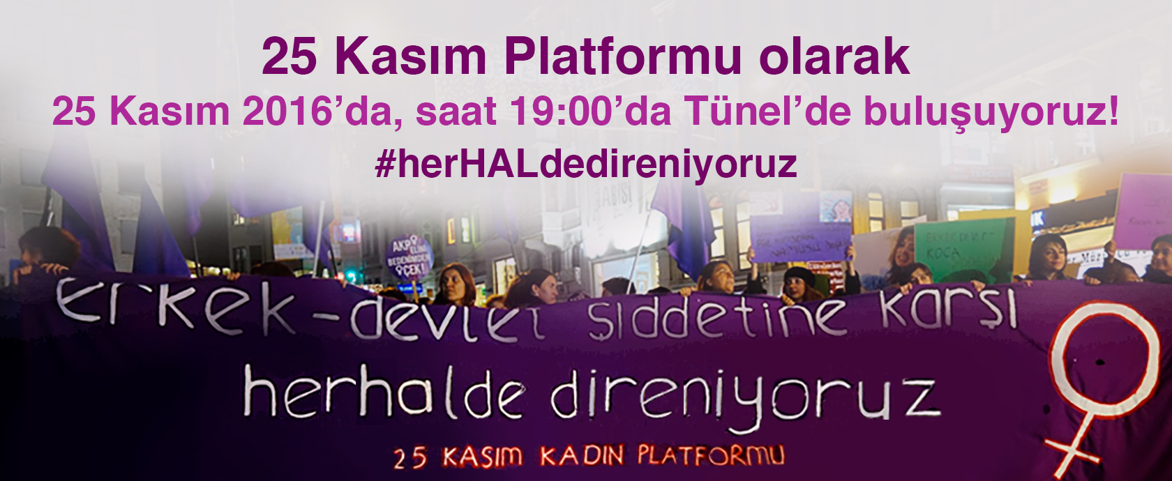 25 Kasım Kadına Yönelik Şiddete Karşı Uluslararası Dayanışma ve Mücadele Günü kapsamında kadınlar olarak 25 Kasım Cuma saat 19.00da Taksim Tünelde 25 Kasım Platformunun çağrısı ile #herHALdedireniyoruz şiarıyla toplanılacaktır.