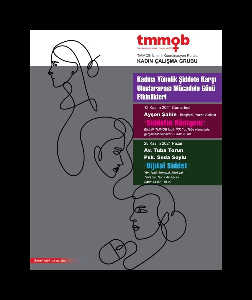TMMOB İzmir İl Koordinasyon Kurulu (İKK) Kadın Çalışma Grubu olarak "25 Kasım Kadına Yönelik Şiddete Karşı Uluslararası Mücadele Günü" kapsamında 28 Kasım 2021 Pazar günü Saat 14.00`de Avukat Tuba Torun ve Psikolog Seda Soylu‘nun katılımıyla `Dijital Şiddet` başlıklı yüzyüze söyleşiyi İzmir Mimarlık Merkezi‘nde düzenliyoruz.