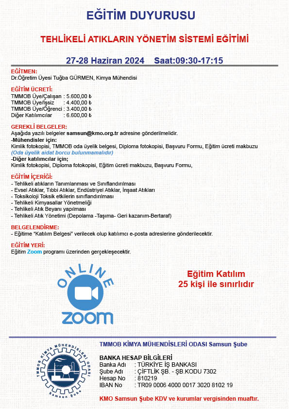 TMMOB Kimya Mühendisleri Odası tarafından 27-28 Haziran 2024 tarihinde "Tehlikeli Atıkların Yönetim Sistemi Eğitimi" ZOOM programı üzerinden online olarak düzenlenecektir. Eğitim ile ilgili detaylı bilgi aşağıda yer almakta olup eğitime katılmak isteyenlerin, ekte gönderilen başvuru formunu doldurup istenen belgeler ile birlikte 21 Haziran 2024 tarihine kadar samsun@kmo.org.tr E-mail adresine göndermelerini rica ederiz.