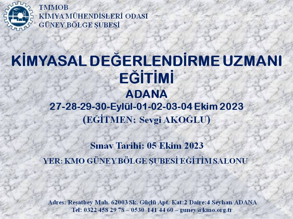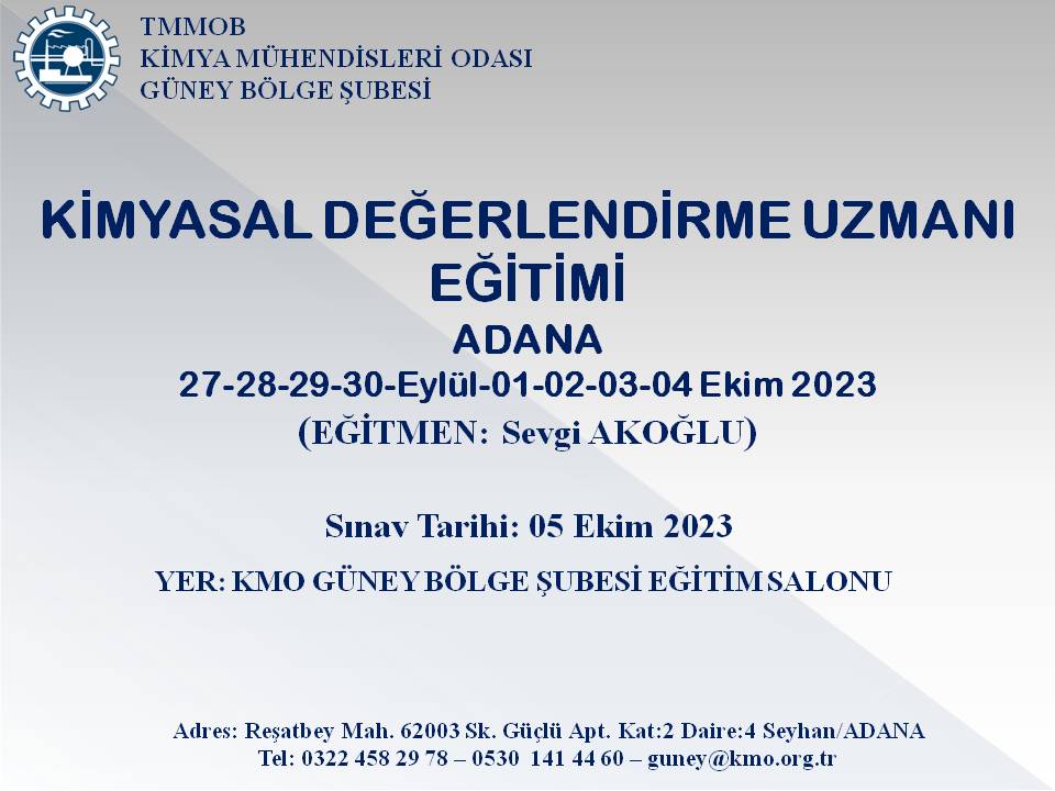 | SINAV TARİHİ, SAATİ VE YERİ | 05 Ekim 2023 (Perşembe ) / 11.00-14.00 TMMOB Kimya Mühendisleri Odası Güney Bölge Şubesi Eğitim Salonu-ADANA |