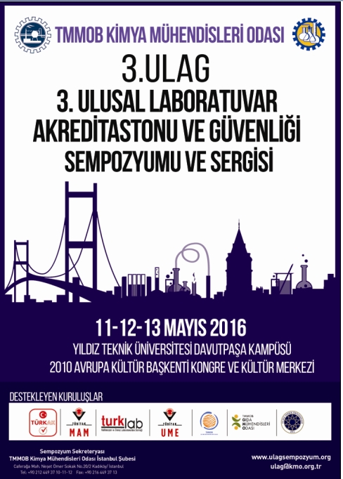 Kimya Mühendisleri Odası İstanbul Şubesi olarak 11-12-13 Mayıs 2016 tarihlerinde, Yıldız Teknik Üniversitesi Davutpaşa Kampüsü 2010 Avrupa Kültür Başkenti Kongre Ve Kültür Merkezi`nde "3. Ulusal Laboratuvar Akreditasyonu ve Güvenliği Sempozyumu ve Sergisi(3.ULAG)" düzenlenecektir.