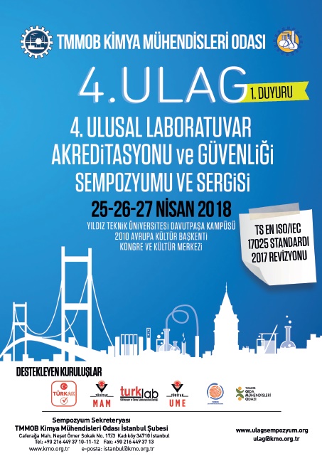 25-26-27 Nisan 2018 tarihlerinde Yıldız Teknik Üniversitesi Davutpaşa Kampüsü‘nde düzenlenecek olan 4. Ulusal Laboratuvar Akreditasyonu ve Güvenliği Sempozyumu ve Sergisi‘nin ( 4.ULAG ) 1. Duyuru ve Sempozyum Dosyası ekte yer almaktadır.