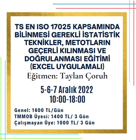 5-6-7 Aralık 2022 tarihlerinde saat 10:00-18:00 saatleri arasında düzenleyeceğimiz `TS EN ISO 17025 Kapsamında Bilinmesi Gerekli İstatistik Teknikler, Metotların Geçerli Kılınması ve Doğrulanması Eğitimi (Excel Uygulamalı)` zoom programı üzerinden online olarak gerçekleşecektir.