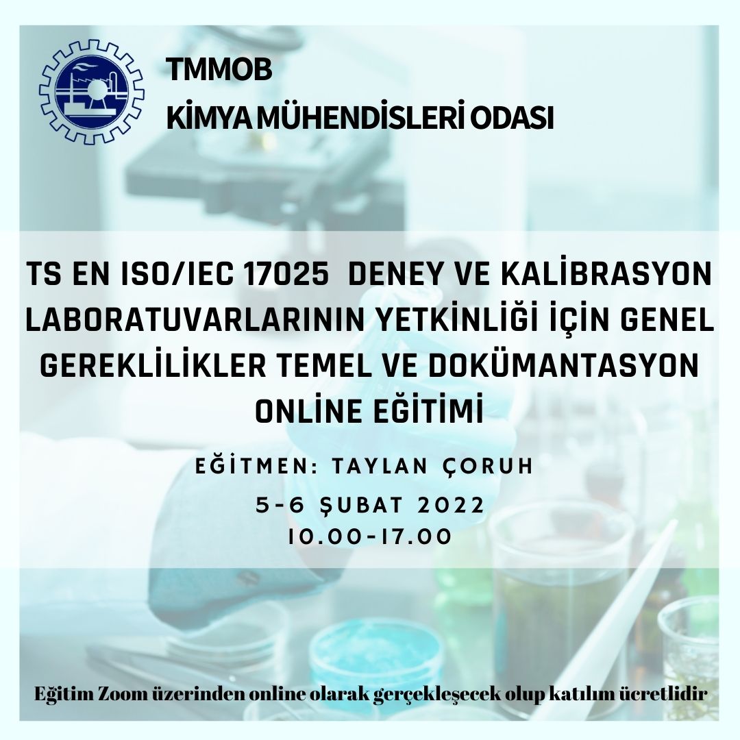 | TS EN ISO/IEC 17025 Deney ve Kalibrasyon Laboratuvarlarının Yetkinliği için Genel Gereklilikler Temel ve Dokümantasyon Eğitimi | TS EN ISO/IEC 17025 ‘standardının madde bazında incelenmesi, Akreditasyon için yapılması gerekli çalışmaların açıklanması. | 5-6 Şubat 2022 10:00-17:00 | Öğrenci Üye 250 TL/2 gün TMMOB İşsiz üye 400 TL/2 gün TMMOB Çalışan üye 520 TL / 2 gün Dışarı Katılımcı 750 TL/2 gün |