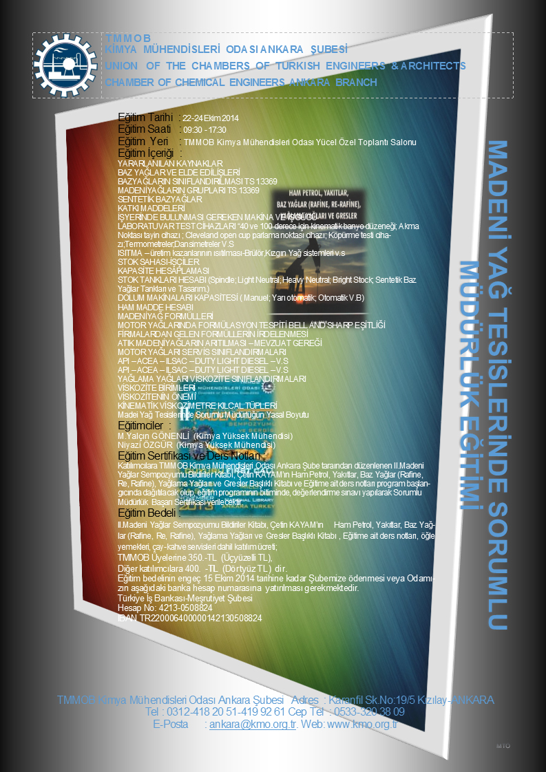 Enerji Piyasası Düzenleme Kurumu tarafından 12 Şubat 2011 tarihinde 27844 sayılı Resmi Gazetede yayınlanarak yürürlüğe giren Madeni Yağların Ambalajlanması ve Piyasaya Sunumu Hakkında Tebliğ ve 23 Aralık 2011 tarihinde 28151 sayılı Resmi Gazetede yayınlanarak yürürlüğe giren Madeni Yağların Ambalajlanması ve Piyasaya Sunumu Hakkında Tebliğde Değişiklik Yapılmasına Dair Tebliğ`in 15.maddesi Kimya, Petrol, Çevre, Makine, Endüstri Mühendislerine ve Kimyagerlere Madeni Yağ Tesislerinde Sorumlu Müdürlük yetkisi vermektedir. TMMOB Kimya Mühendisleri Odası Ankara Şubesi olarak gerek işletmelere yardımcı olmak, gerekse Madeni Yağ Tesislerinde çalışan Sorumlu Müdürlerin bilinçli bir şekilde görevlerini yapmaları amacıyla Madeni Yağ Tesislerinde Sorumlu Müdür Eğitimi düzenlenecektir.