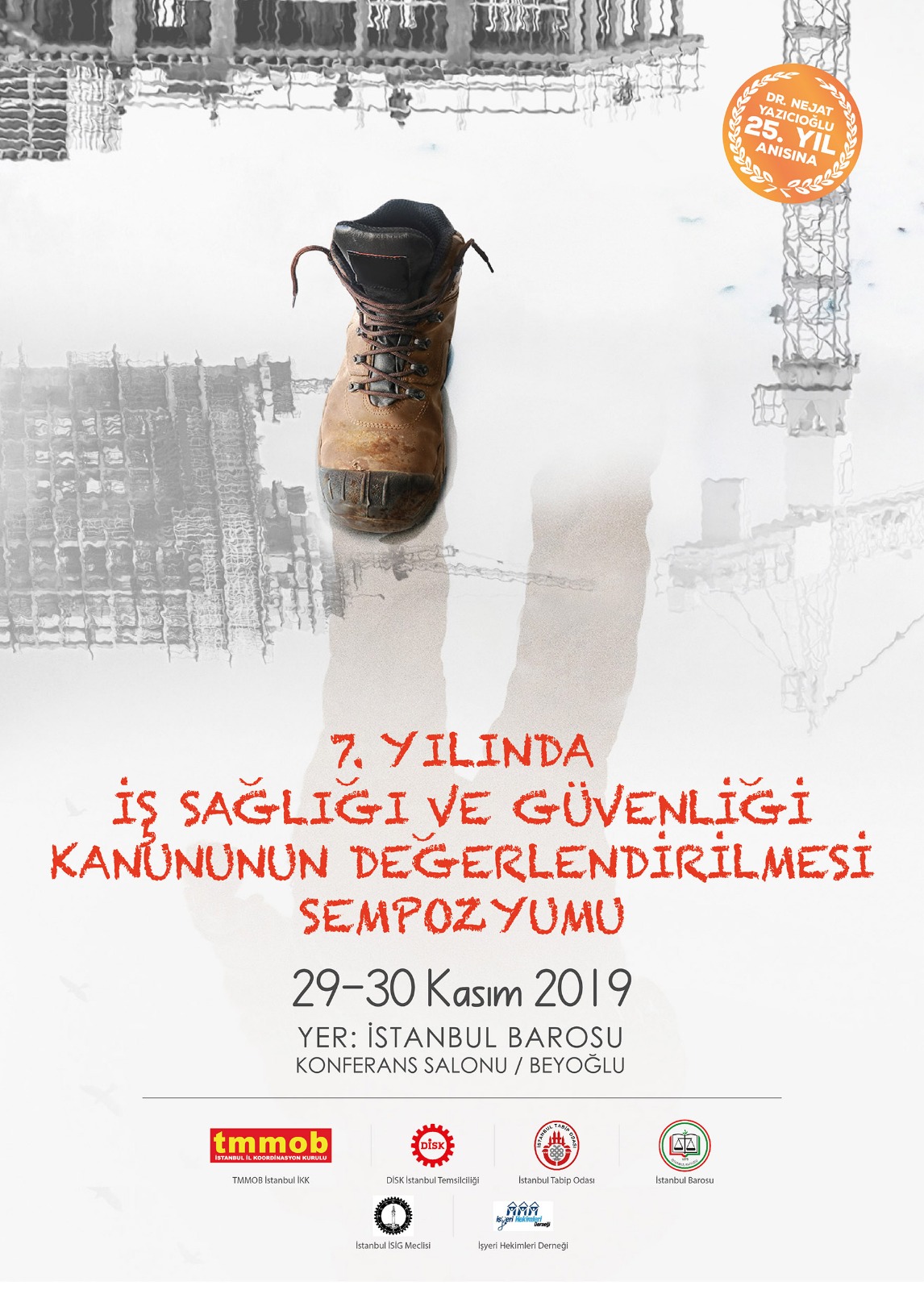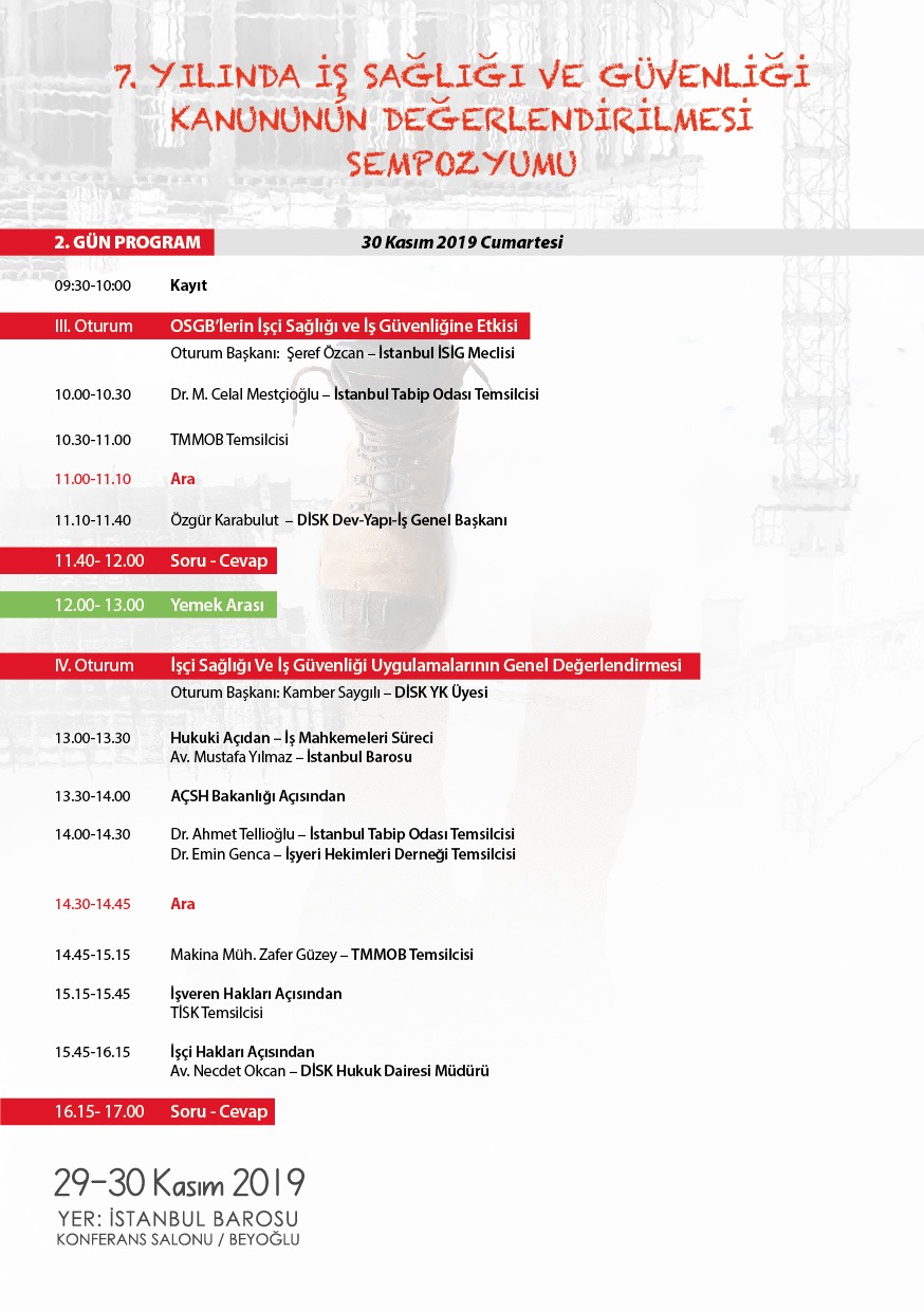 6331 Sayılı İSİG Kanununun 7. yılında, İSİG alanında sözü olan tüm meslek odaları, sendikalar ve dernekler olarak, AÇSHB ve İLO temsilcilerinin katılımı ile 29-30 Kasım 2019`da, İstanbul Barosu toplantı salonunda buluşuyoruz.