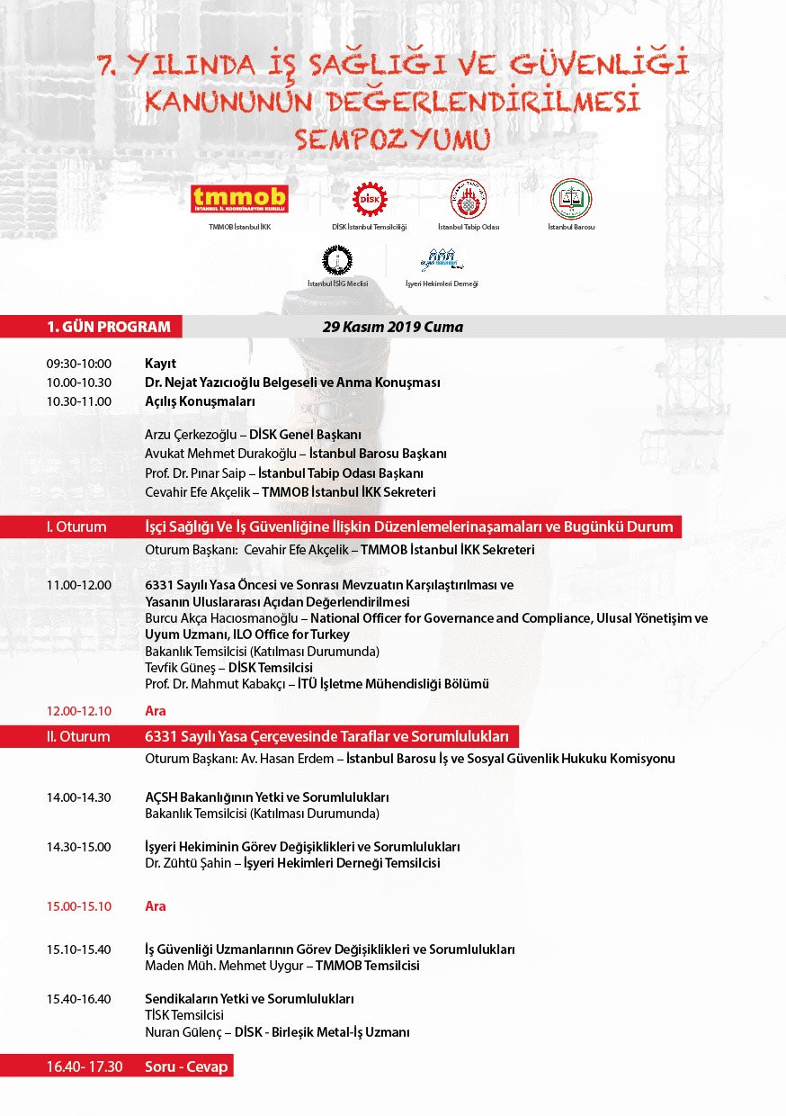 6331 Sayılı İSİG Kanununun 7. yılında, İSİG alanında sözü olan tüm meslek odaları, sendikalar ve dernekler olarak, AÇSHB ve İLO temsilcilerinin katılımı ile 29-30 Kasım 2019'da, İstanbul Barosu toplantı salonunda buluşuyoruz.