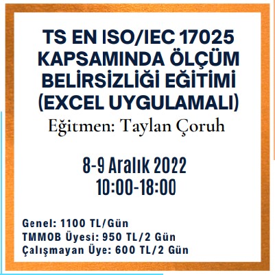 8-9 Aralık 2022 tarihlerinde 10.00-18.00 saatleri arasında düzenleyeceğimiz `TS EN ISO/IEC 17025 Kapsamında Ölçüm Belirsizliği (Excel Uygulamalı) Eğitimi ` zoom programı üzerinden online olarak gerçekleşecektir.