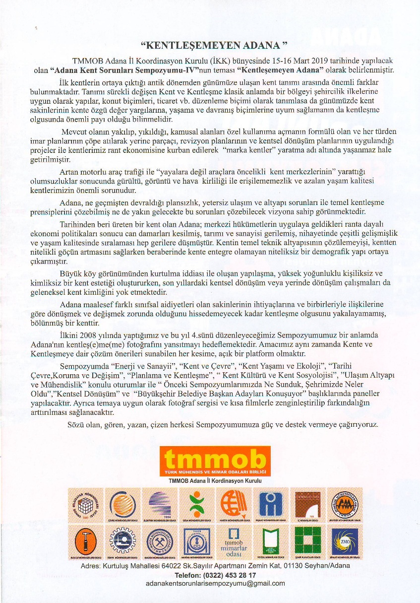 15-16 Mart 2019 tarihlerinde Seyhan Belediyesi Yaşar Kemal Kültür Merkezinde TMMOB Adana İl Koordinasyon Kurulu tarafından "Kentleşemeyen Adana" temasıyla düzenlenecek olan "Adana Kent Sorunları Sempozyumu-4" e tüm üyelerimizin katılımını bekler, saygılar sunarız.