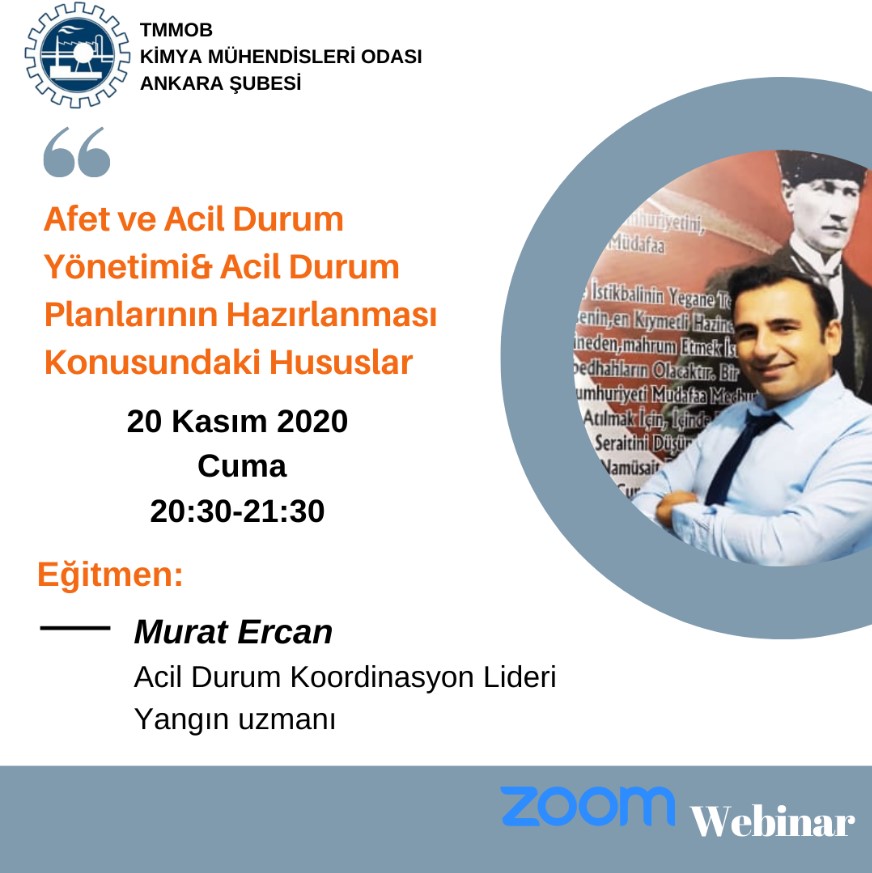 20 Kasım 2020 Cuma günü 20:30 - 21:30 saatleri arasında Acil Durum Koordinasyon Lideri ve Yangın Uzmanı Sn. Murat Ercan`ın sunumuyla "Afet ve Acil Durum Yönetimi & Acil Durum Planlarının Hazırlanması Konusundaki Hususlar" Eğitimi gerçekleştirilecektir. Ücretsiz gerçekleştirilecek eğitime katılım formu için lütfen tıklayınız.